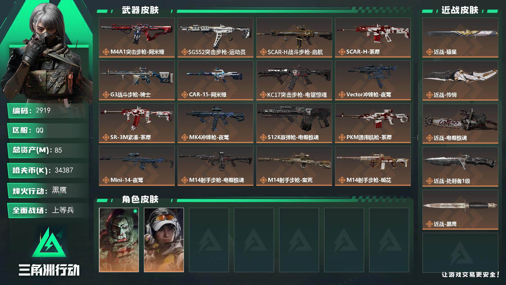 84m总资产-183k哈夫币-60烽火等级-黑鹰-50战场等级-上等兵【干员
