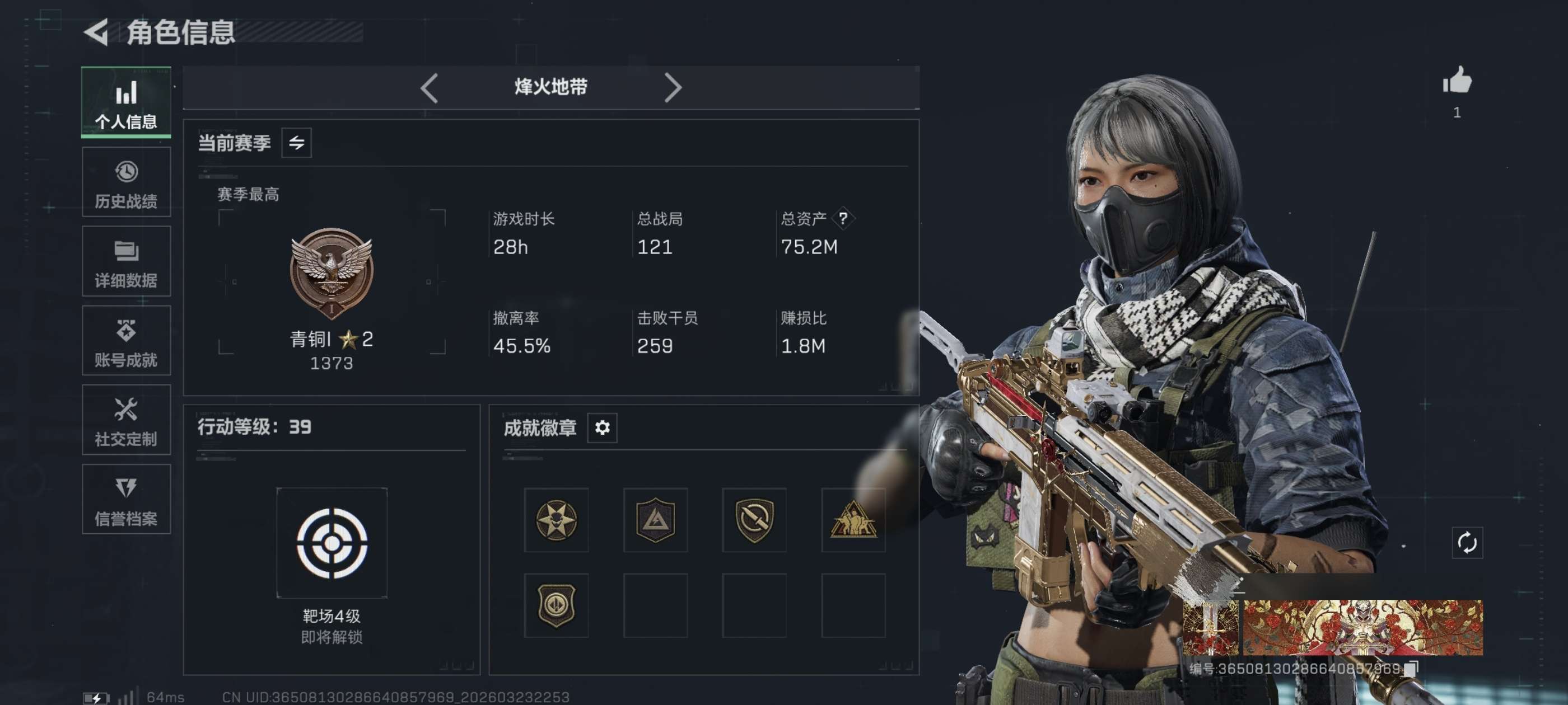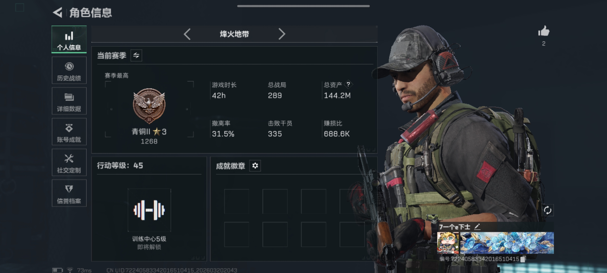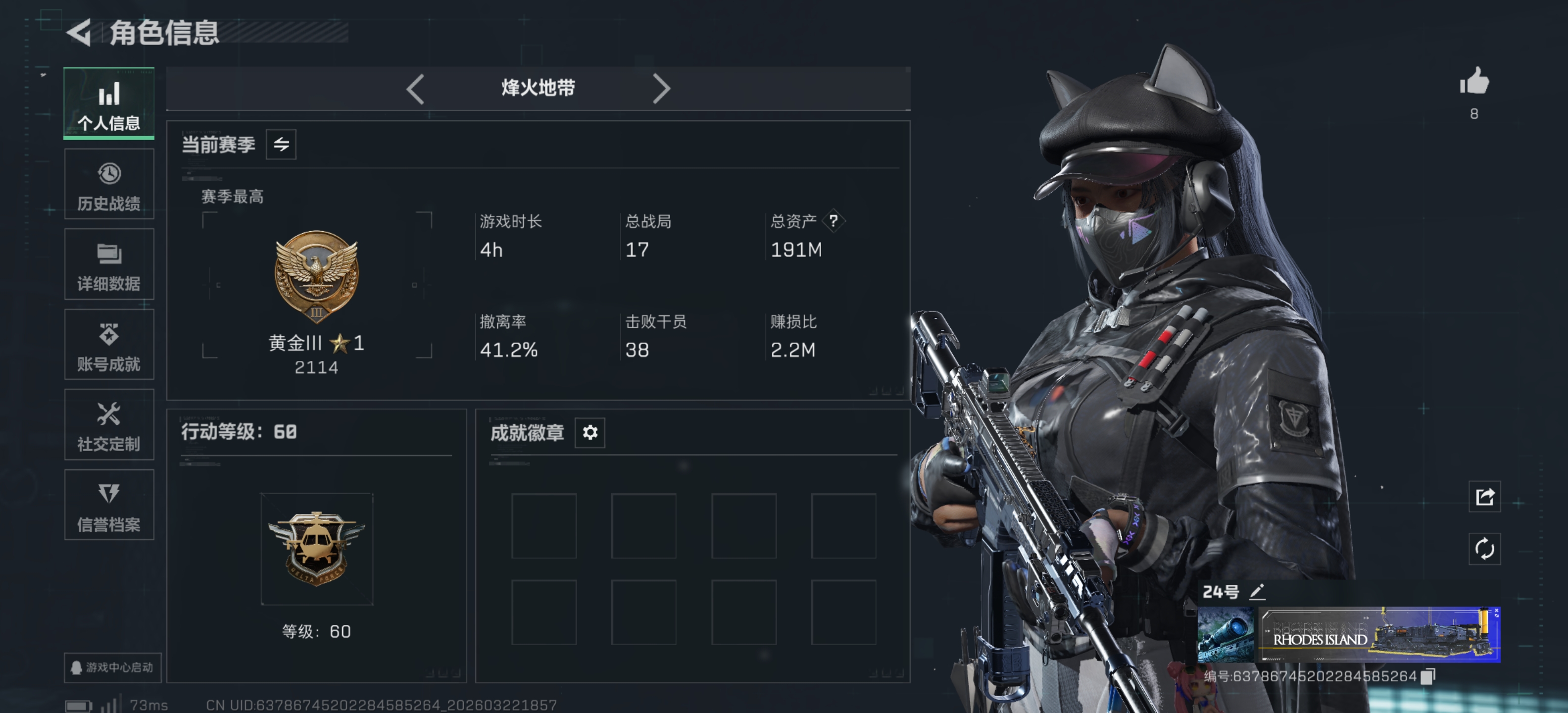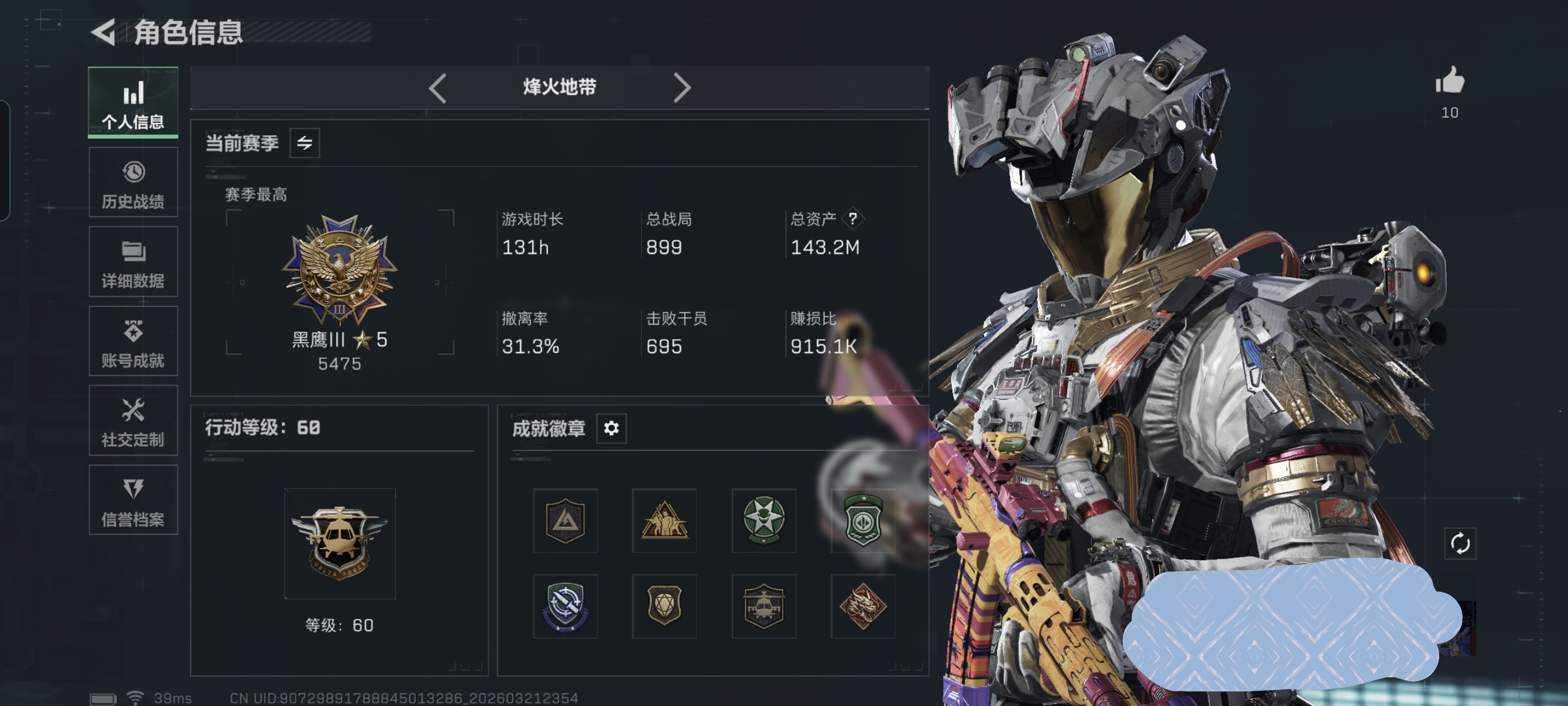 46m总资产-142k哈夫币-60烽火等级-三角洲巅峰-33战场等级-军士长