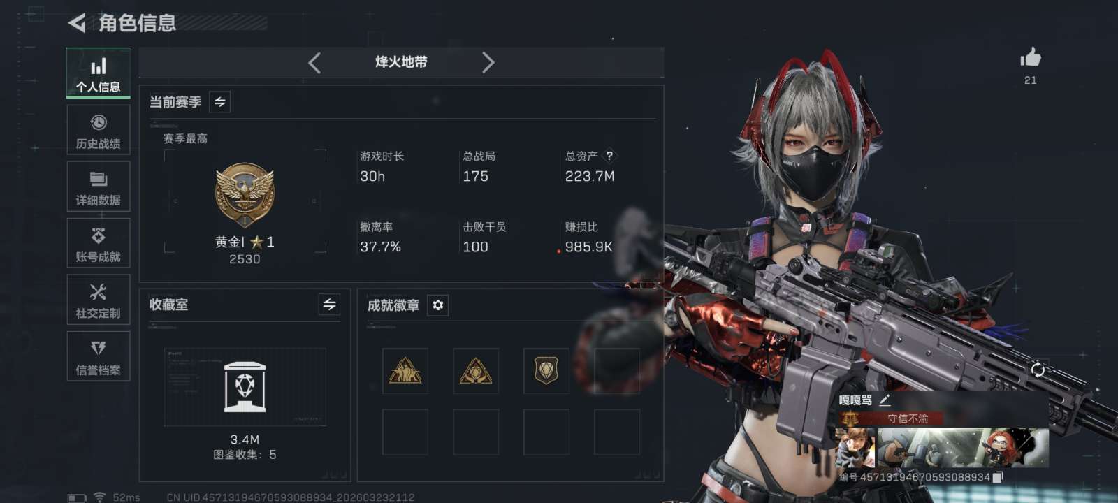 !!!红皮麦晓雯 4m总资产-262k哈夫币-35烽火等级-铂金-1战场