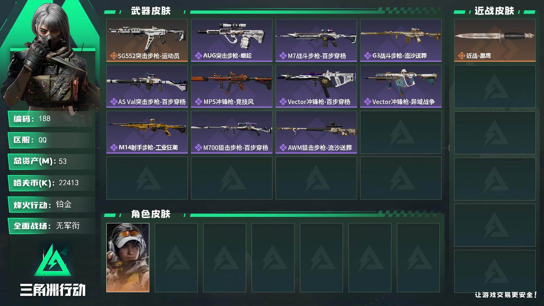 烽火段位白银2 战场段位暂无段位 总资产112.5M 哈夫币10039W 挂饰3 近战1 枪械1 载具2