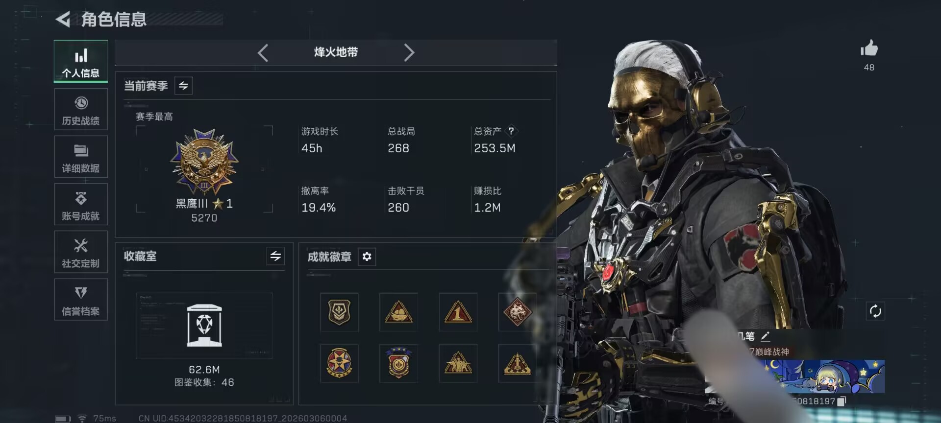 61m总资产-3287k哈夫币-60烽火等级-黄金-25战场等级-上等兵【干