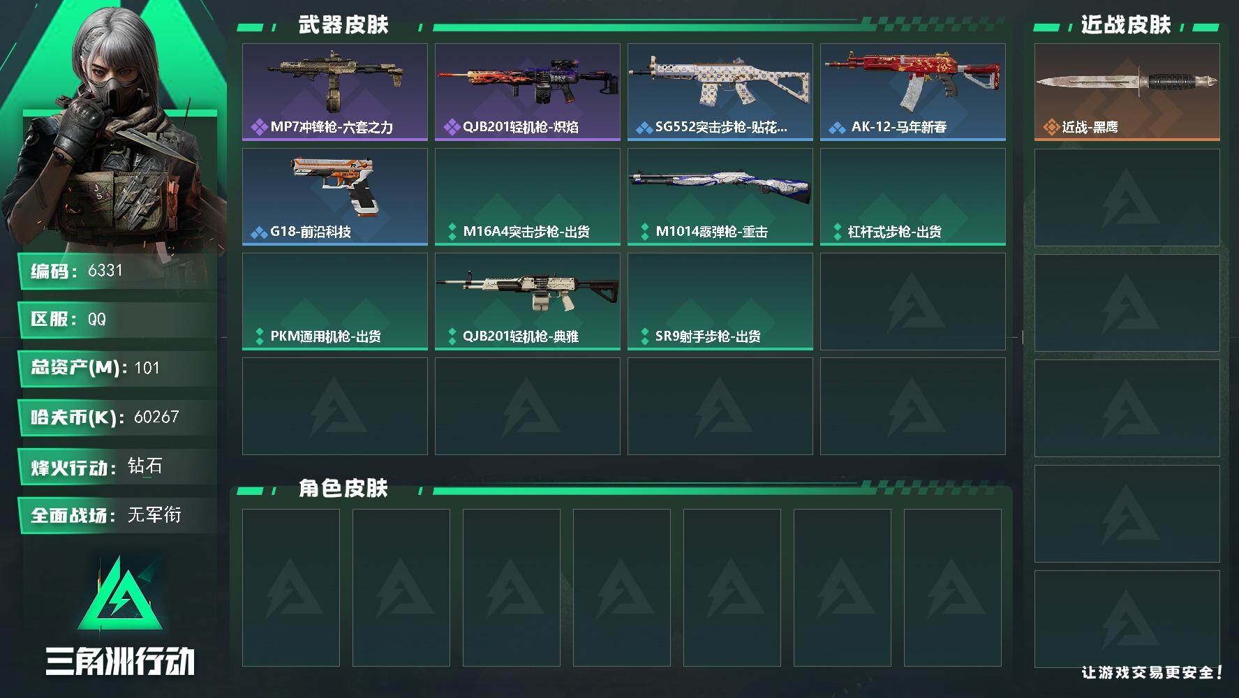 101m总资产-60267k哈夫币-50烽火等级-钻石-1战场等级-无军衔【