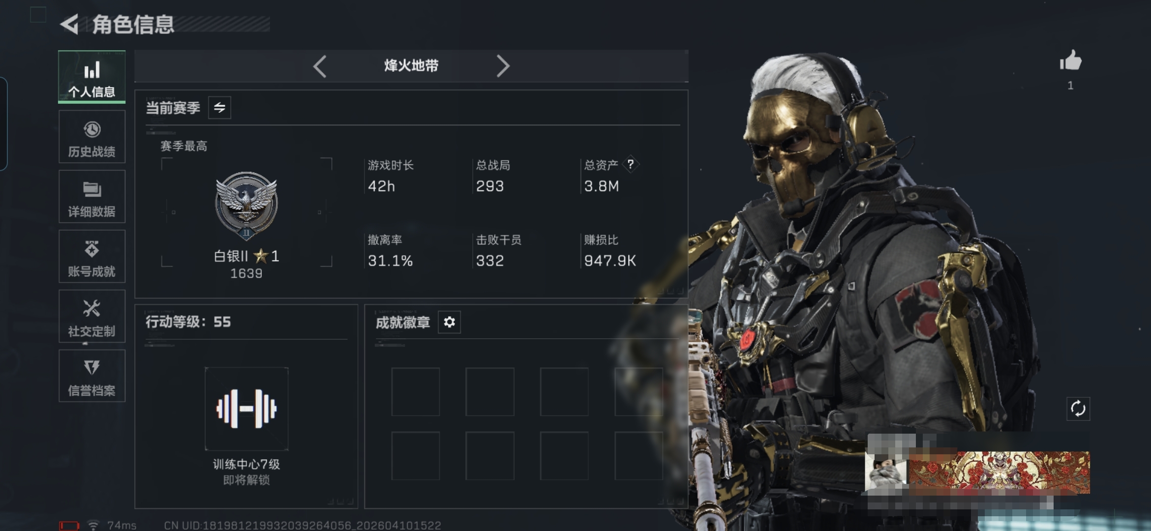 122m总资产-490k哈夫币-60烽火等级-黄金-20战场等级-上等兵ws0