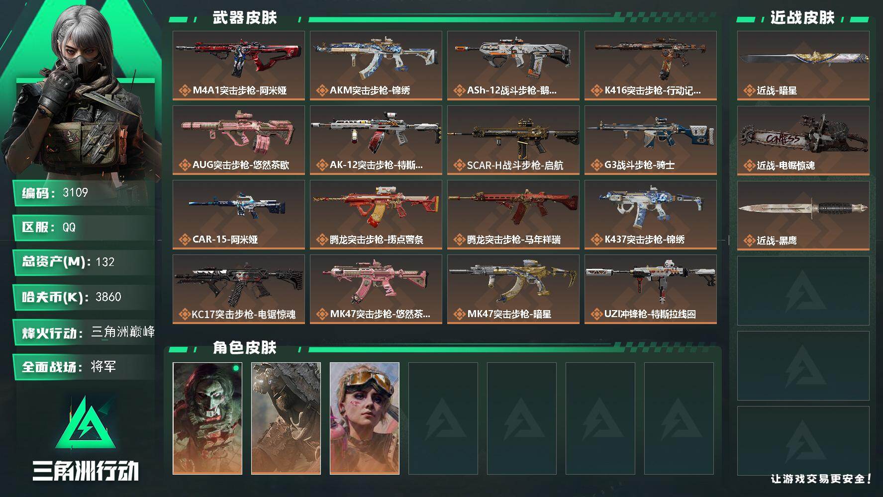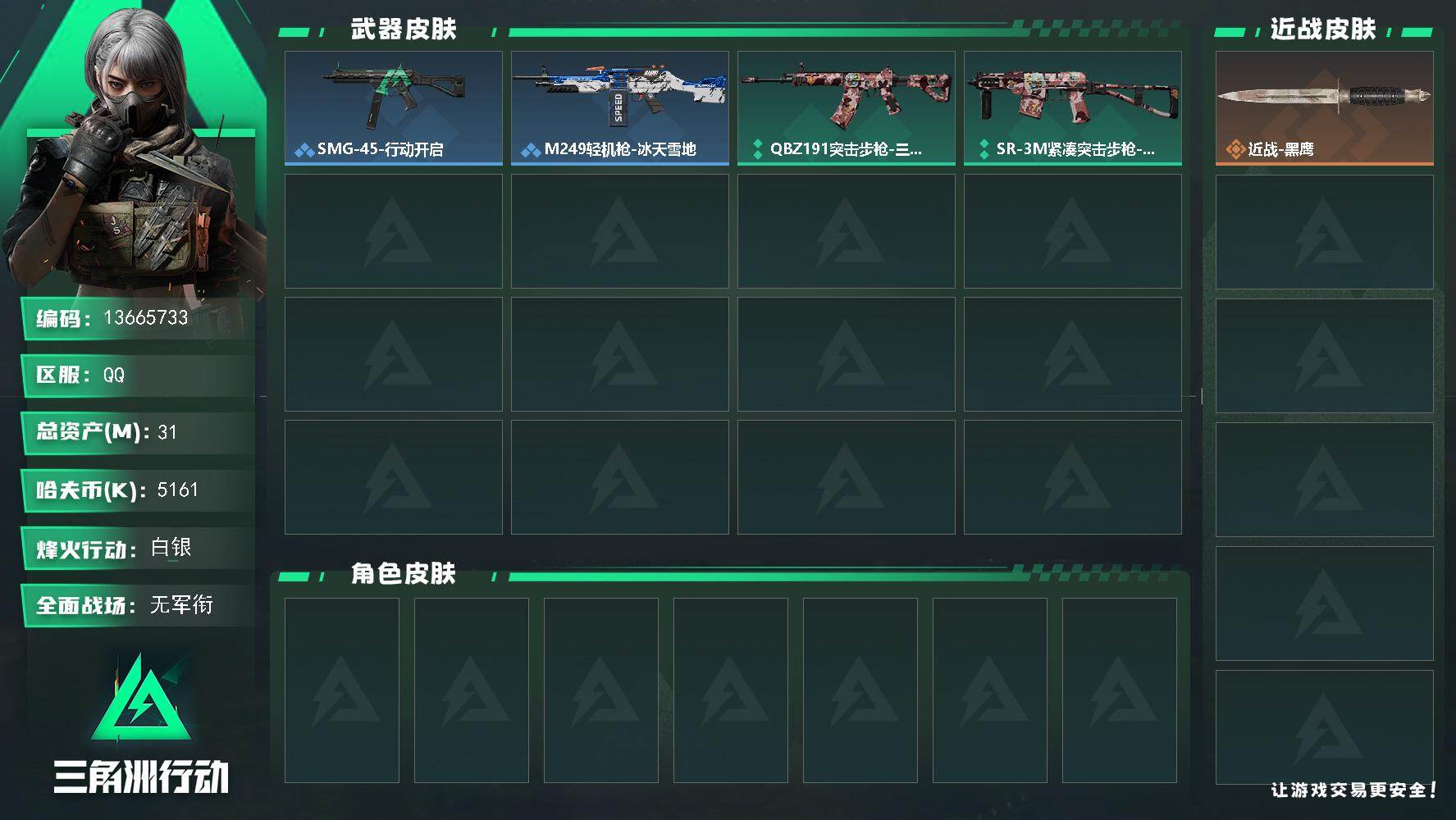 烽火段位钻石2 战场段位校官2 总资产255.7M 哈夫币188W 干员2 挂饰20 近战1 枪械175 载具17