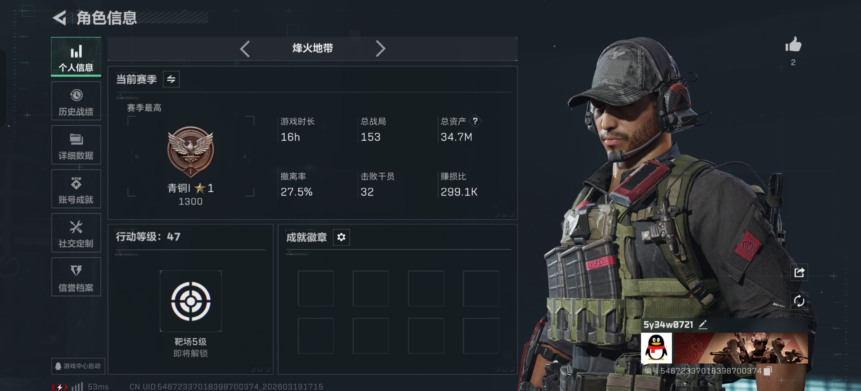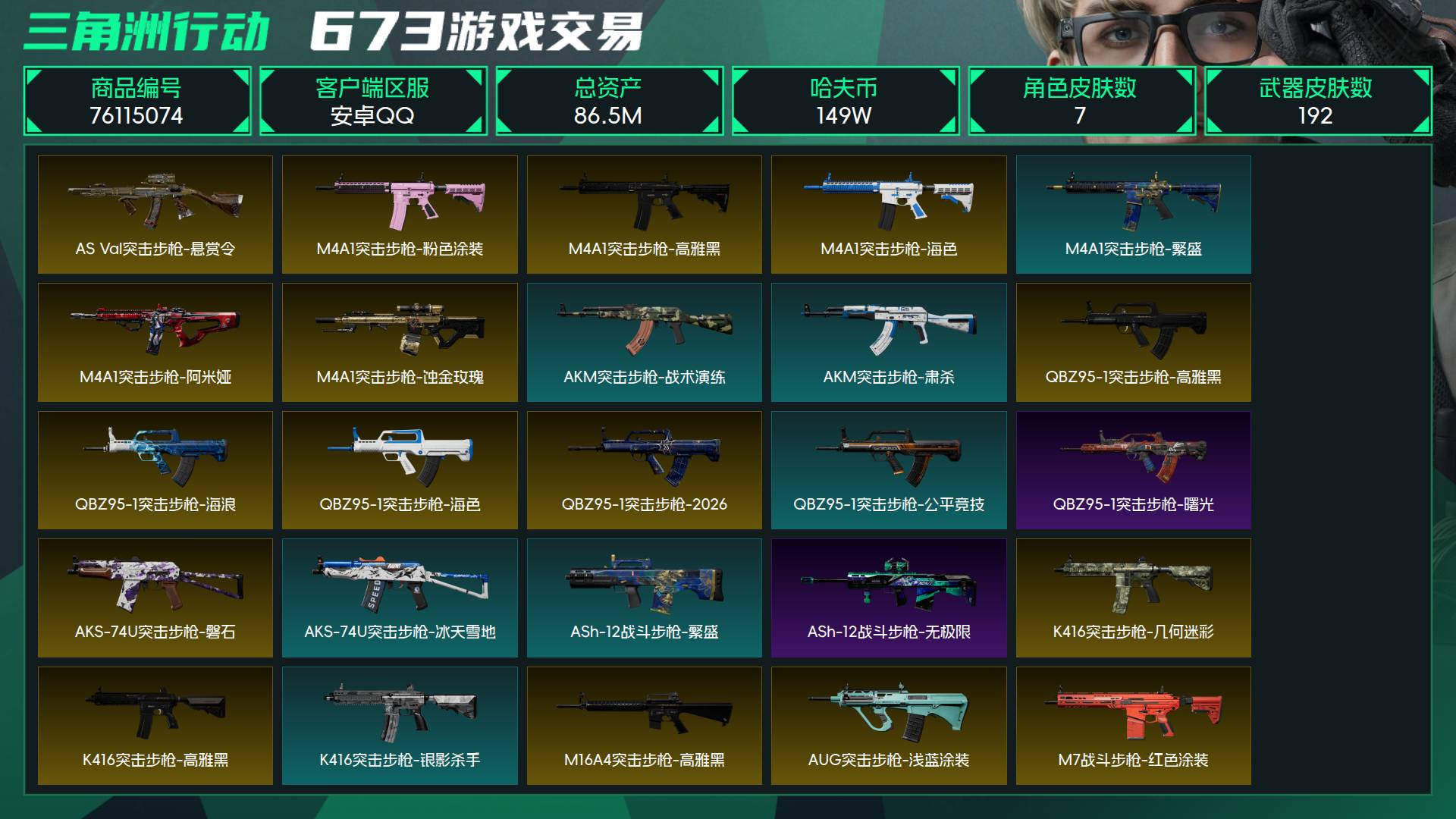 烽火段位黑鹰3 战场段位军士长1 总资产86.5M 哈夫币149W 干员7 挂饰31 近战2 枪械192 载具15