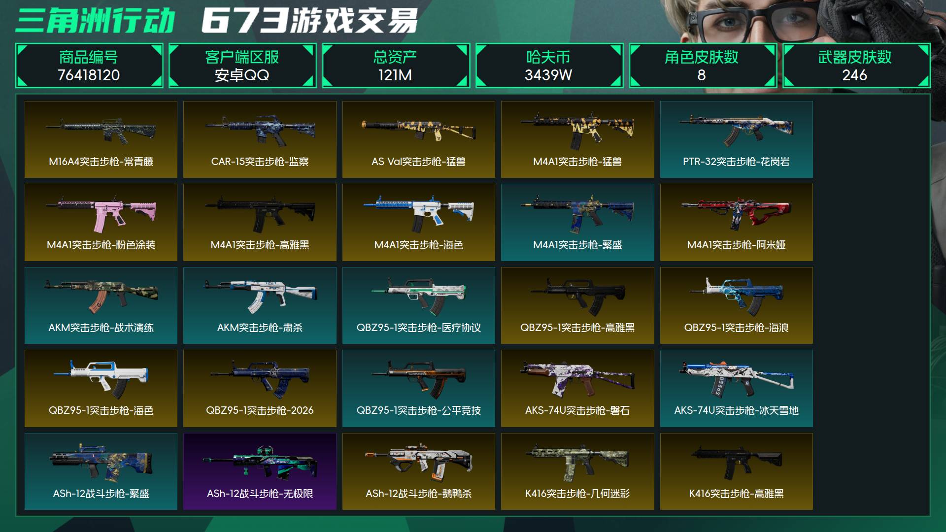 烽火段位黑鹰5 战场段位军士长1 总资产121M 哈夫币3439W 干员8 挂饰35 近战7 枪械2