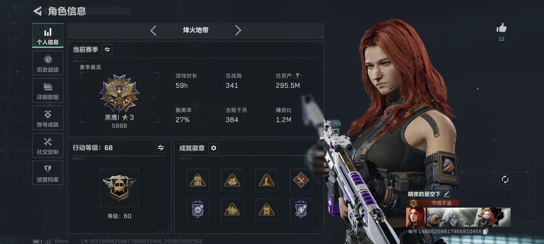 57m总资产-237k哈夫币-60烽火等级-黑鹰-35战场等级-上等兵【干员