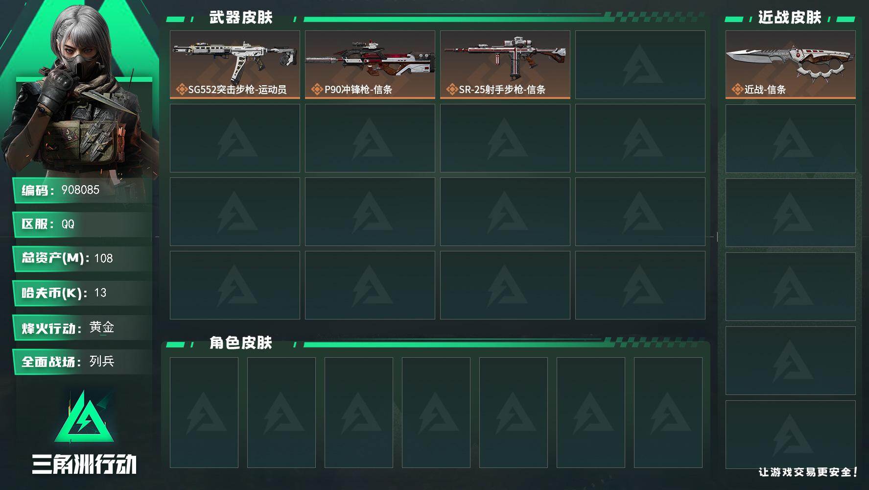 总资产:100M 1干员外观 1近战传说 13传说枪械 哈