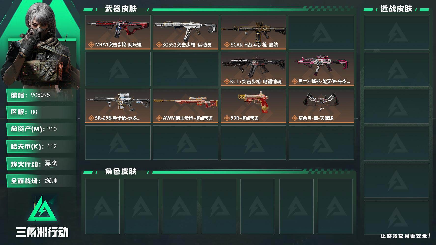 总资产:210.2M 2干员外观 1近战传说 27传说枪械 哈夫币:112K