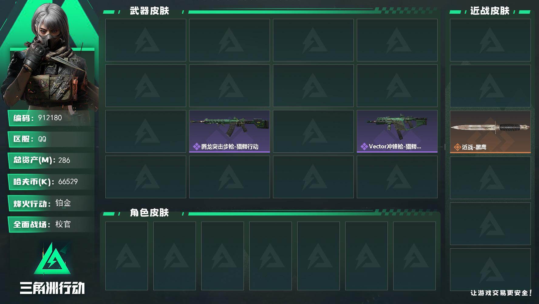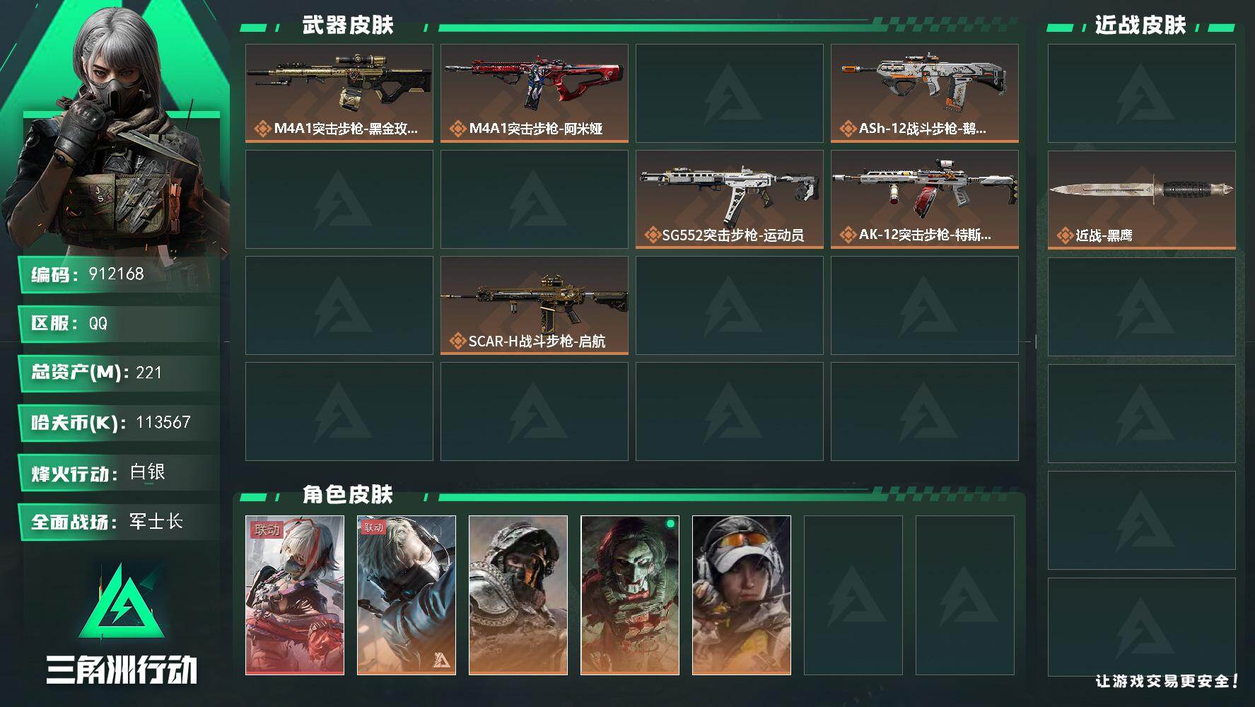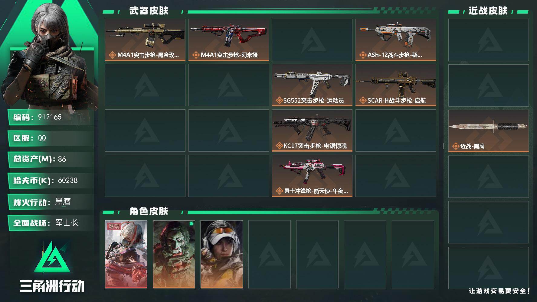 86m总资产-60238k哈夫币-60烽火等级-黑鹰-31战场等级-军士长