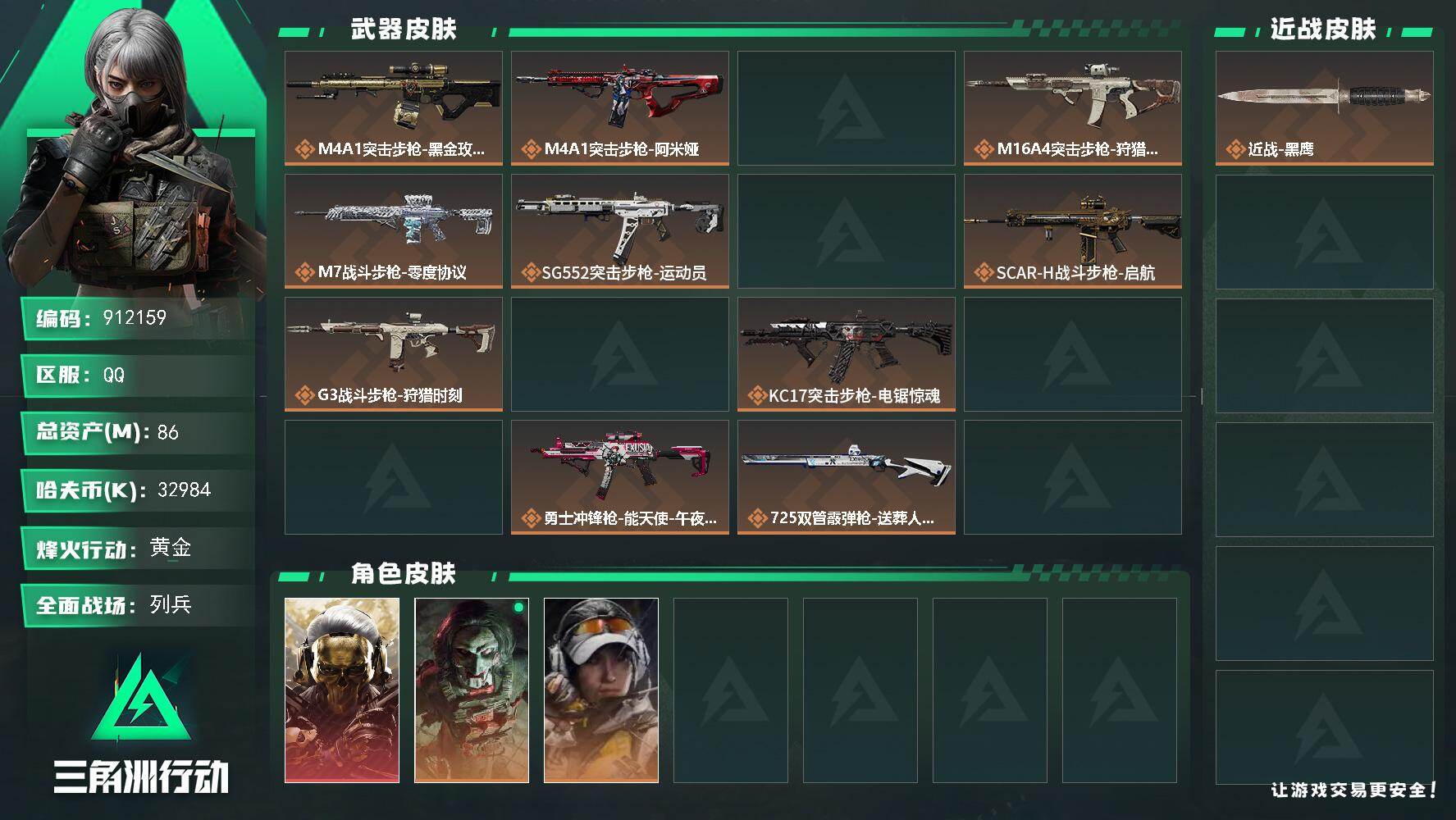 86m总资产-32984k哈夫币-60烽火等级-黄金-29战场等级-列兵