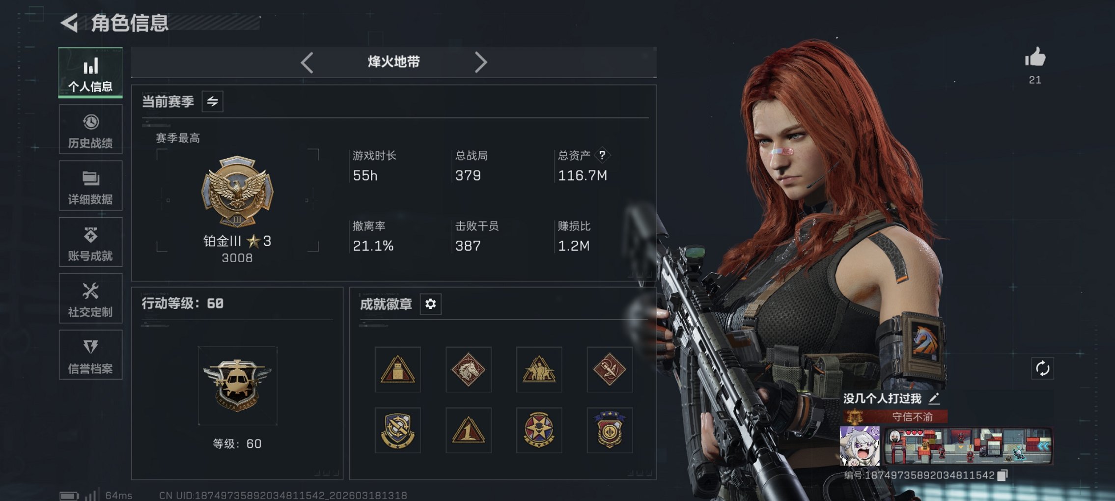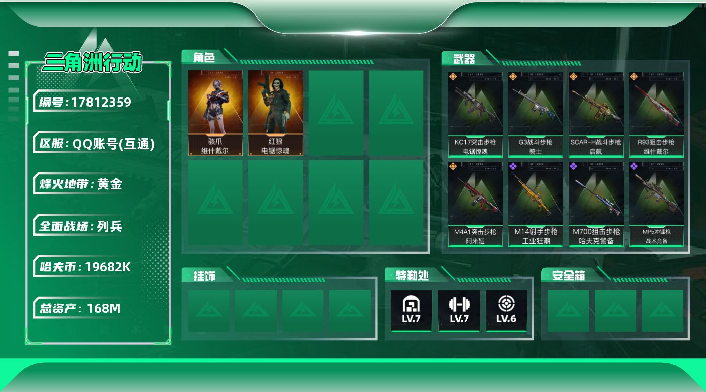 148m总资产-2122k哈夫币-60烽火等级-钻石-5战场等级-无军衔【干