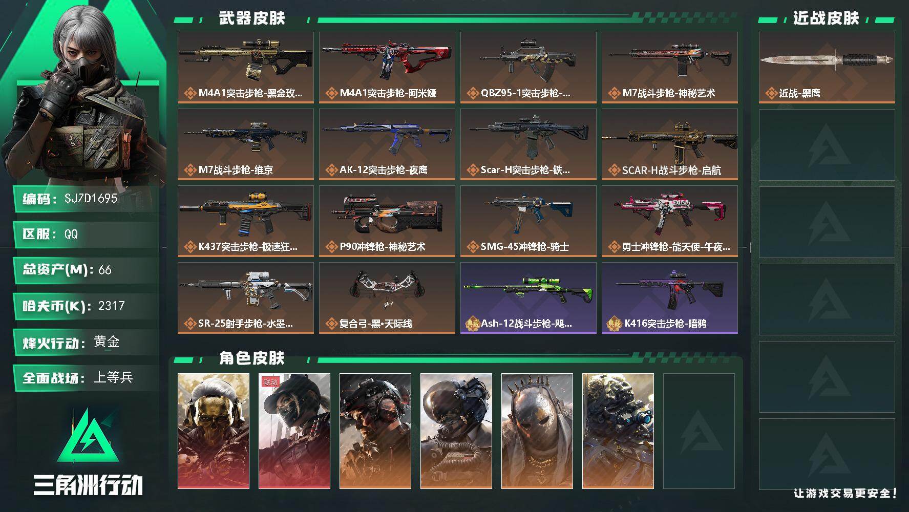 总资产(M):66M/哈夫币(K):2317K/哈夫币(K):2317K/传说枪皮数:14/全面战场