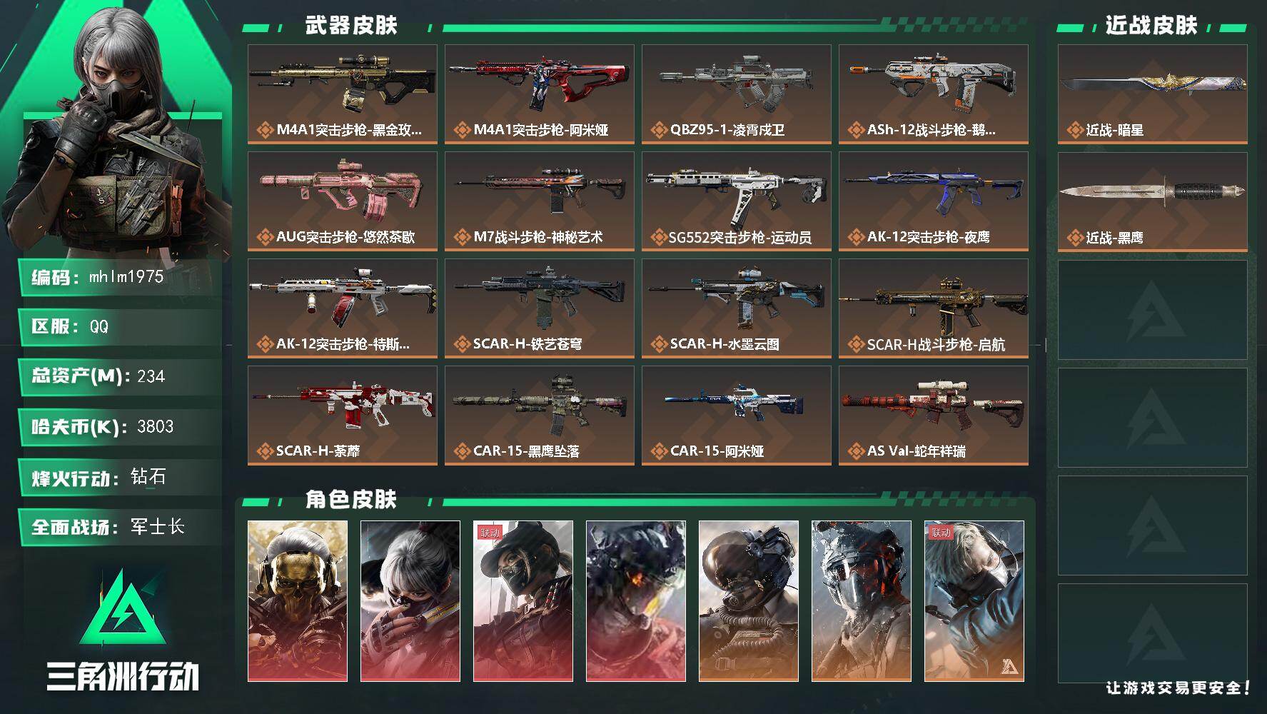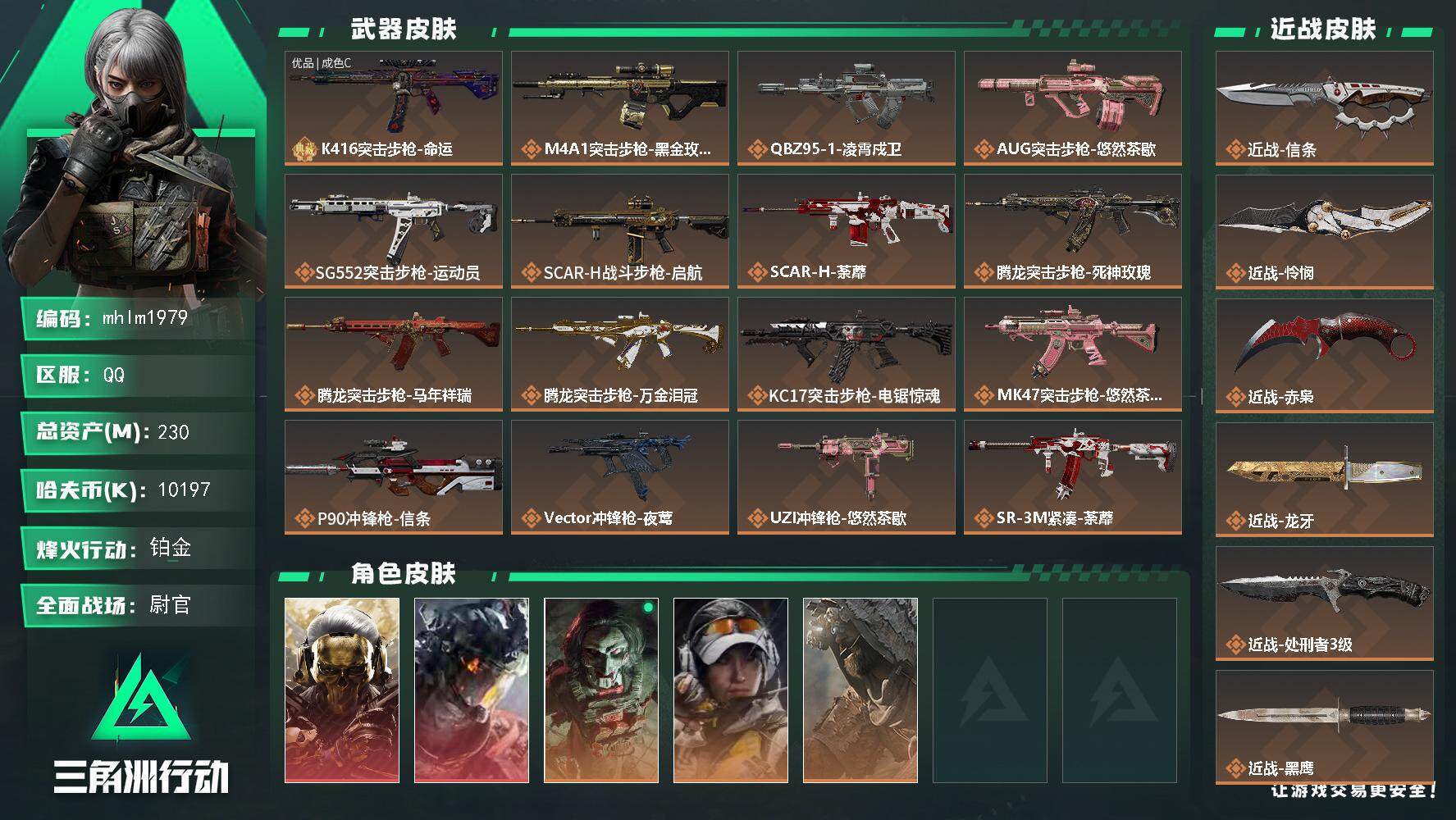 干员外观数:4 近战数:2 典藏数:12 枪械数:230 载具数:12 烽火地带等级:60 全面战场等级:24