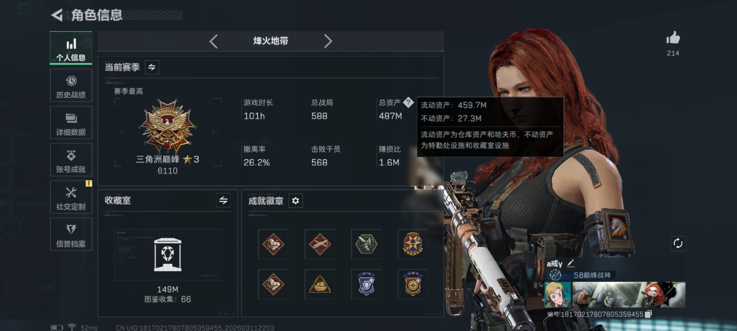 仓库级/靶场级/训练中心级-总资产890m-哈夫币603m-烽火等级:60级