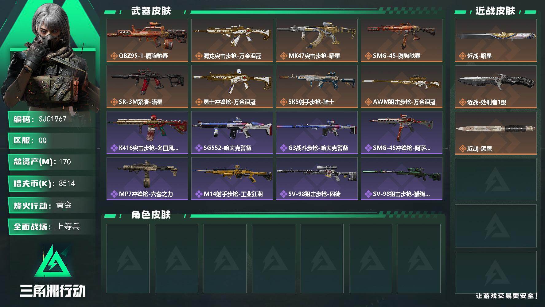 39m总资产-4713k哈夫币-60烽火等级-黑鹰-50战场等级-上等兵【干
