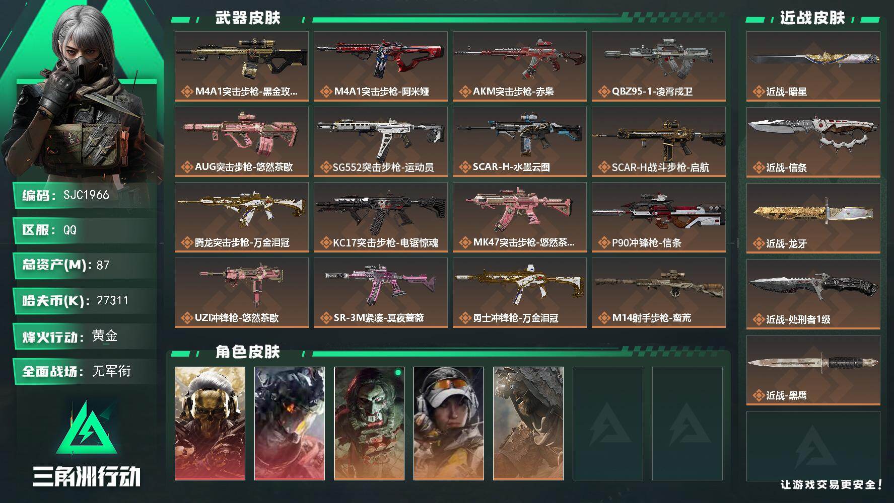 87m总资产-27311k哈夫币-60烽火等级-黄金-5战场等级-无军衔