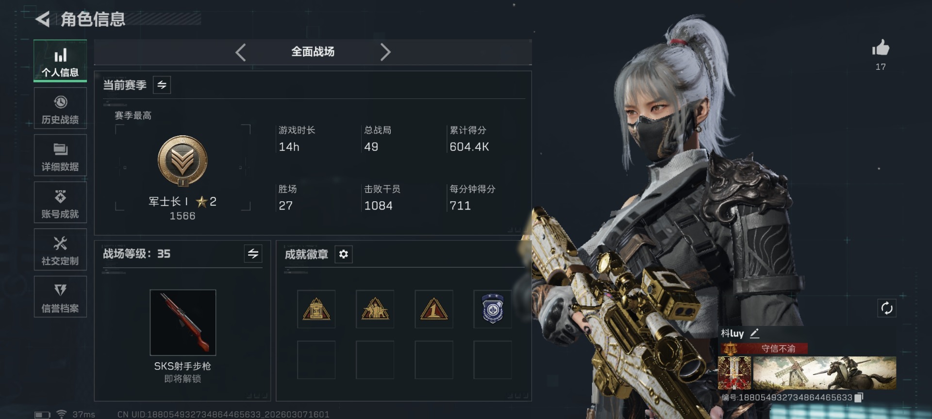 109m总资产-1068k哈伏币-60烽火等级-钻石-50战场等级-尉官【干
