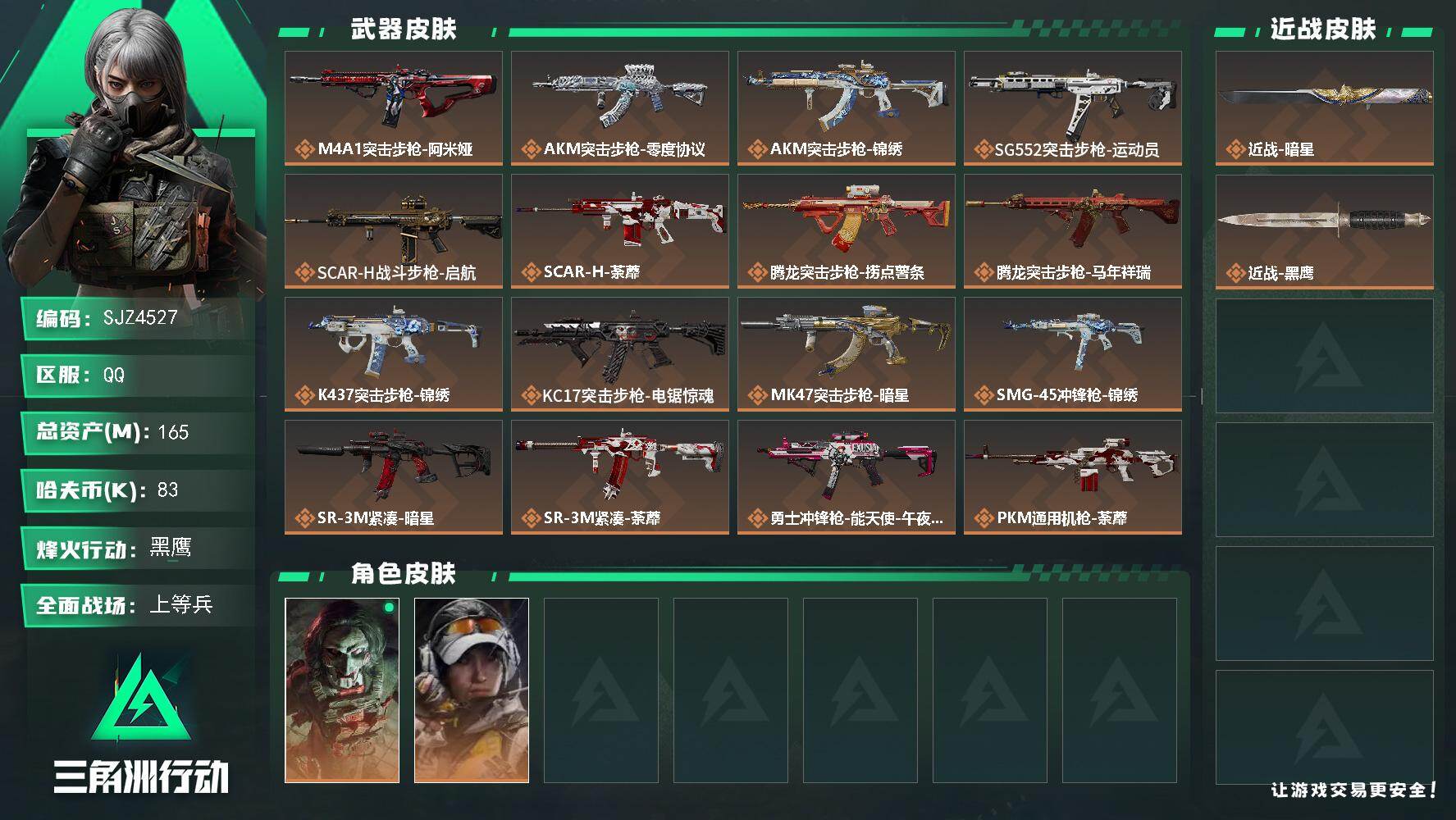 总资产(M):165M/哈夫币(K):83K/传说枪皮数:24/全面战场等级:31_段位:上等兵/烽火地带等级:60_段位:黑鹰