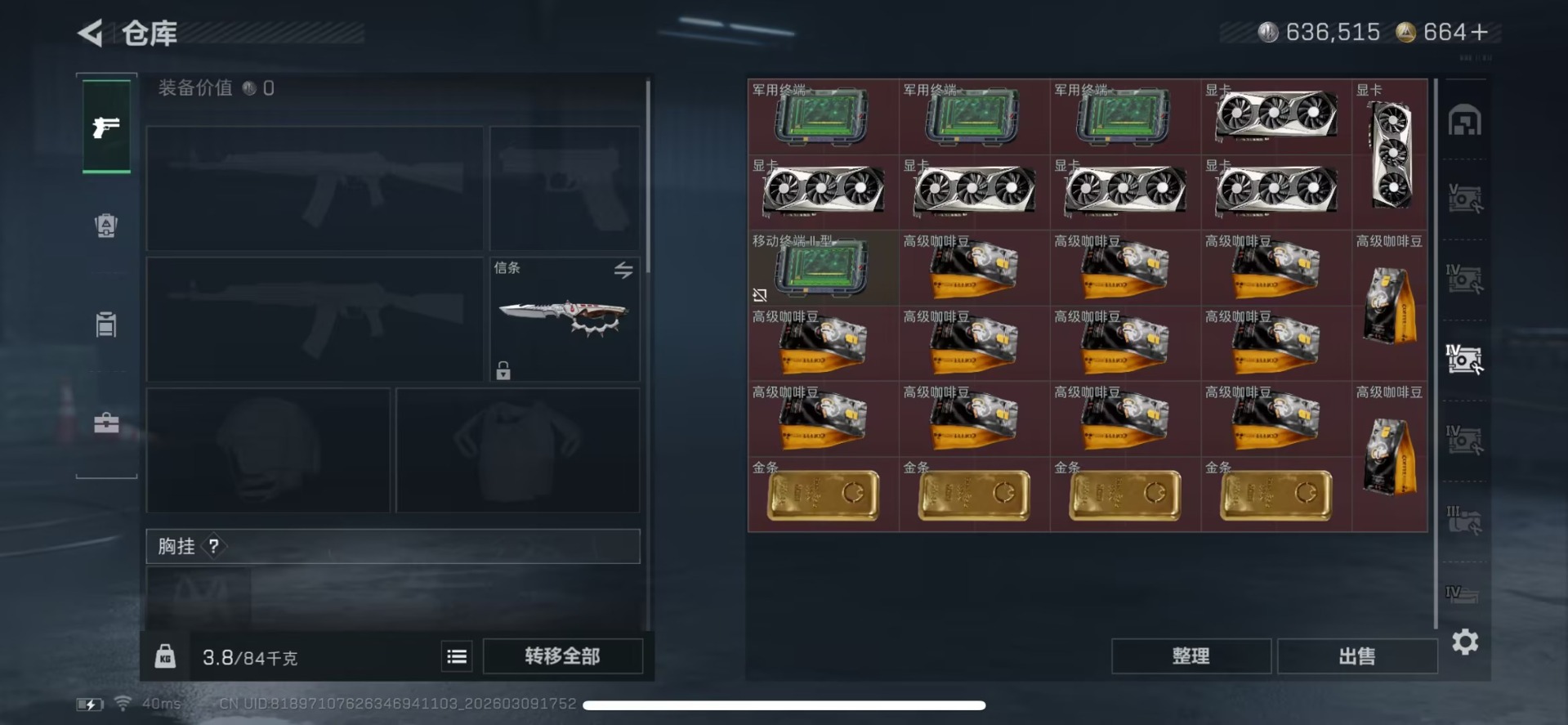 总资产:169.6M 4干员外观 3近战传说 35传说枪械 哈夫币:421.465K 顶级安全箱(3×3)4.11号到期