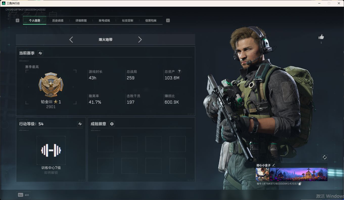 N6299/QQ区/哈夫币2362W/总资产103.6M/行动等级54/战场等级1/近战/黑鹰/干员