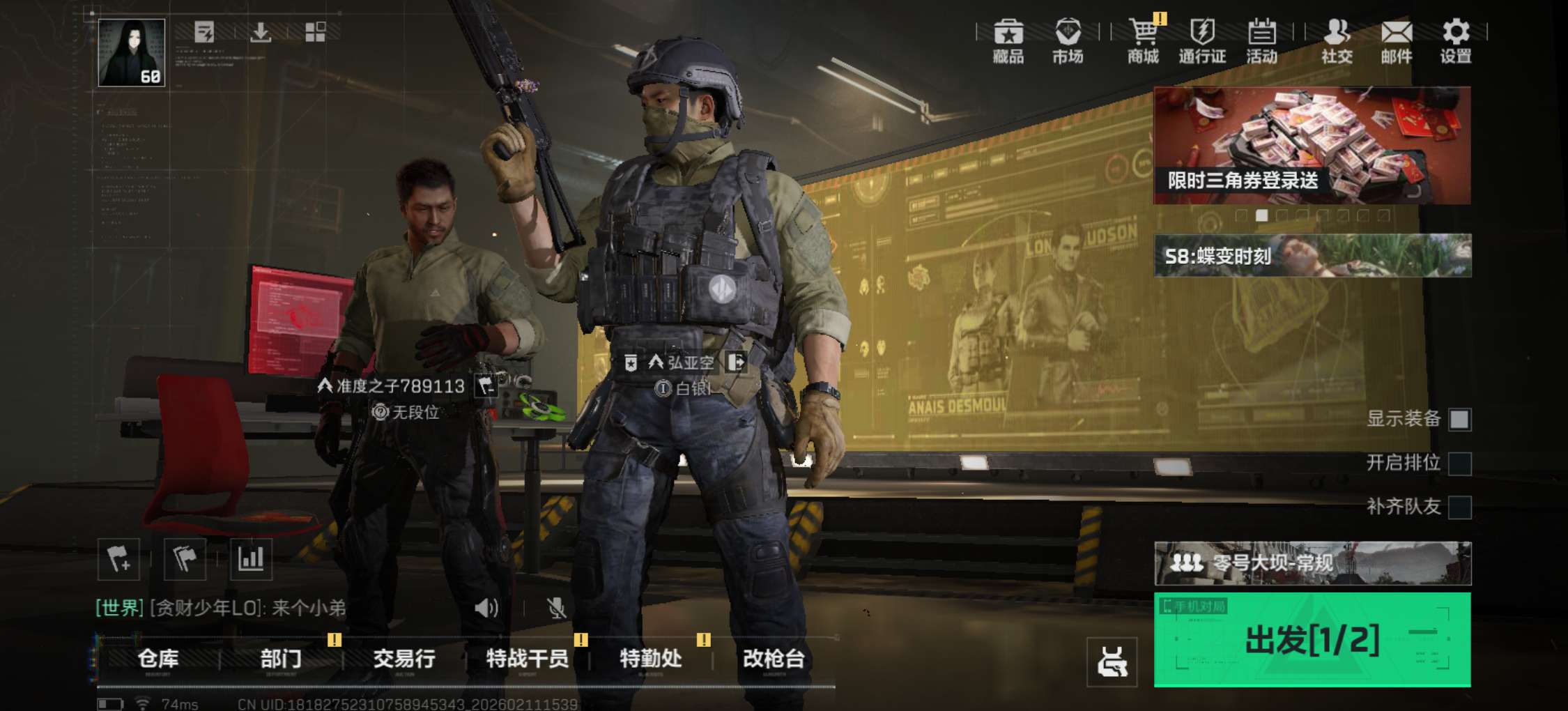 总资产:71.6M,哈夫币:36W,武器皮肤110,烽火60级:钻石,战场23