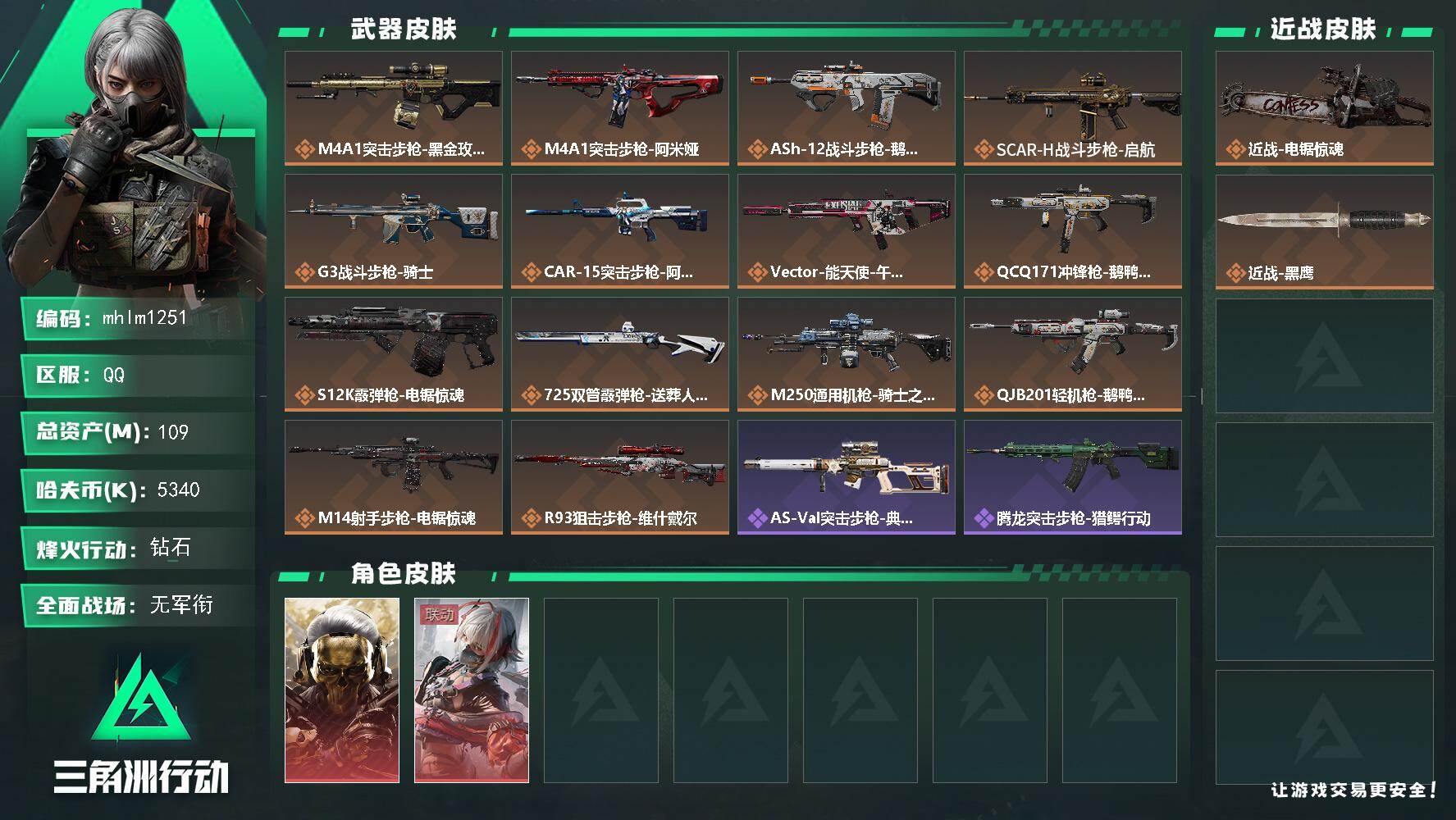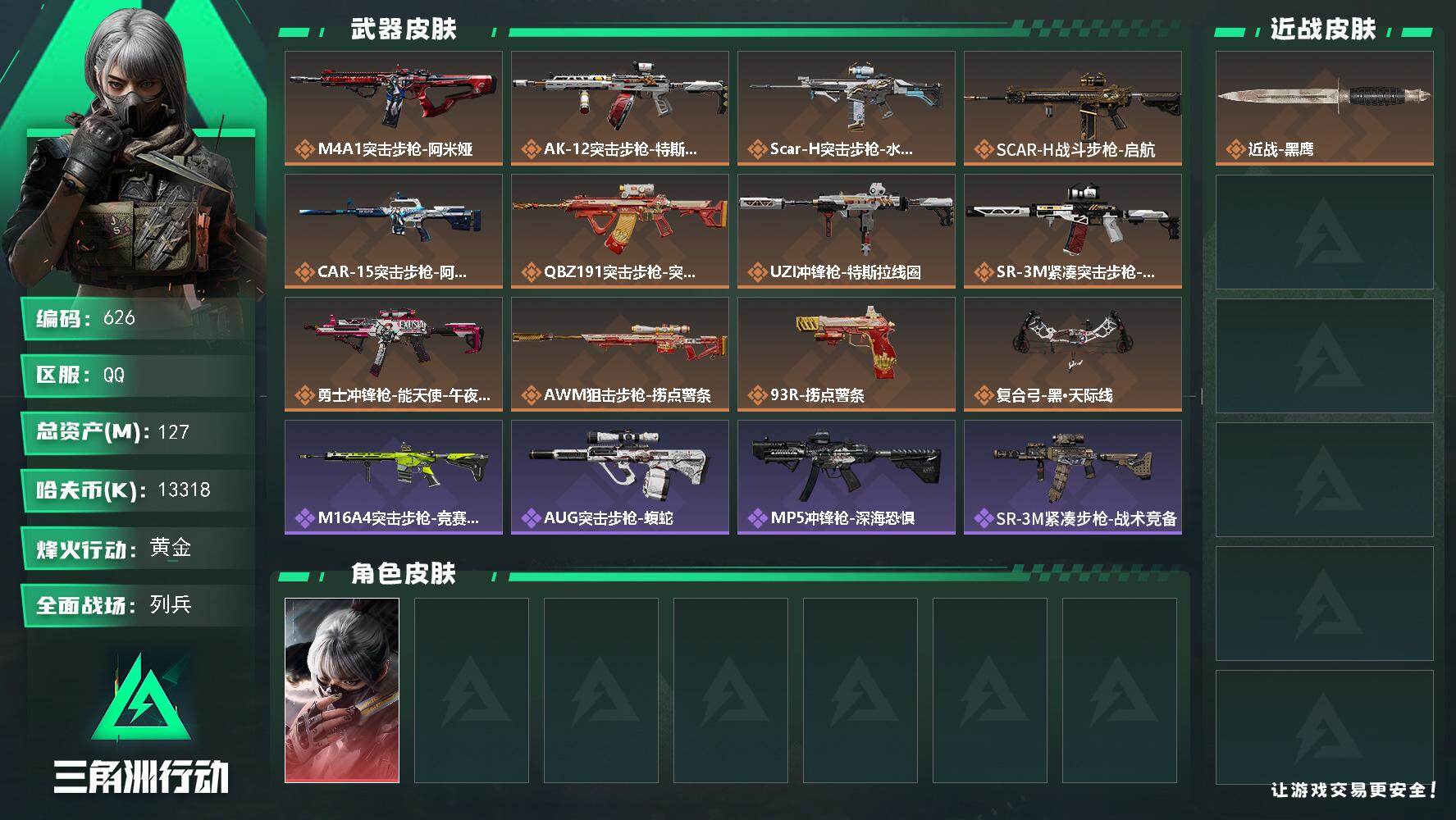 总资产:166M,哈夫币:420W,武器皮肤104,烽火60级:黑鹰,战场27