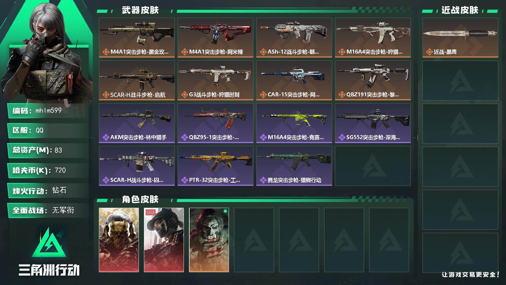 总资产:83.2M,哈夫币:72W,武器皮肤169,烽火60级:钻石,通行证5