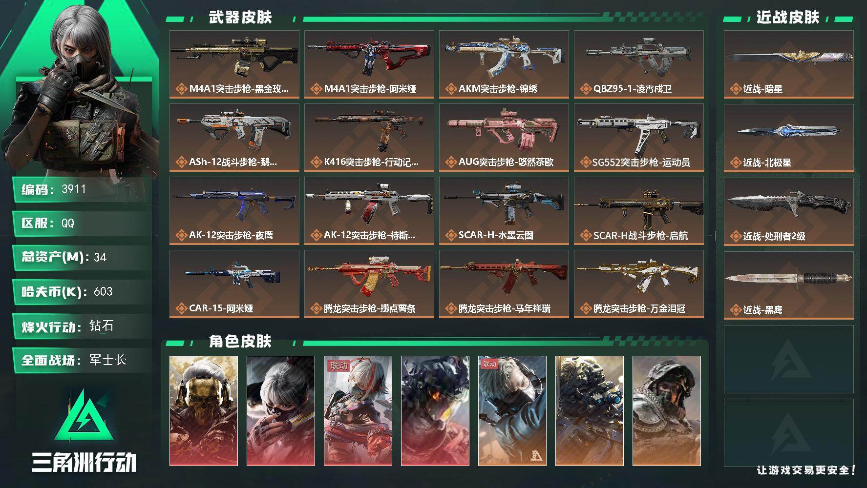 34m总资产-603k哈夫币-60烽火等级-钻石-34战场等级-军士长【干员