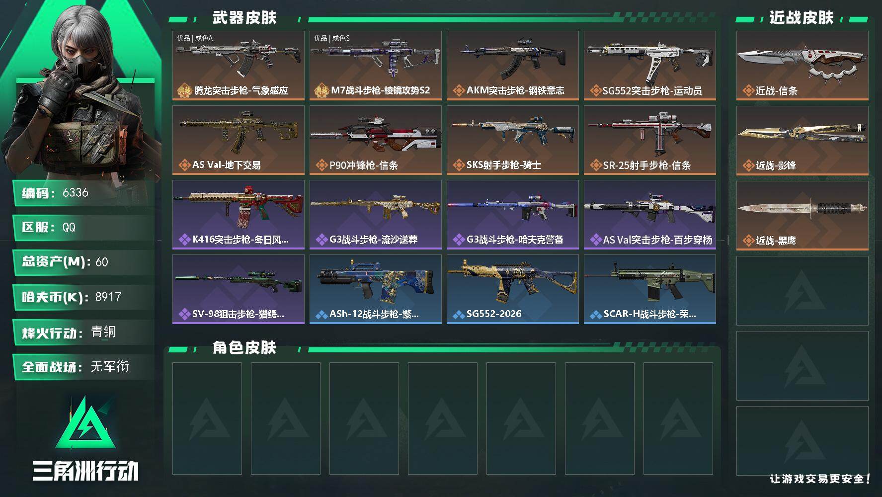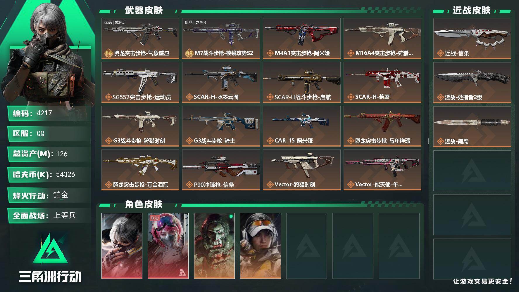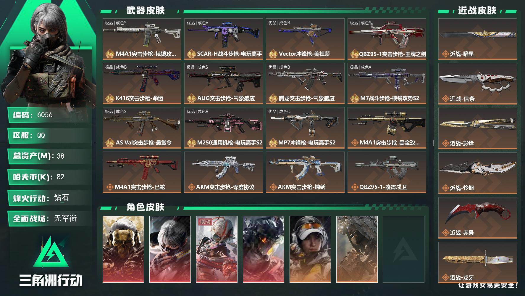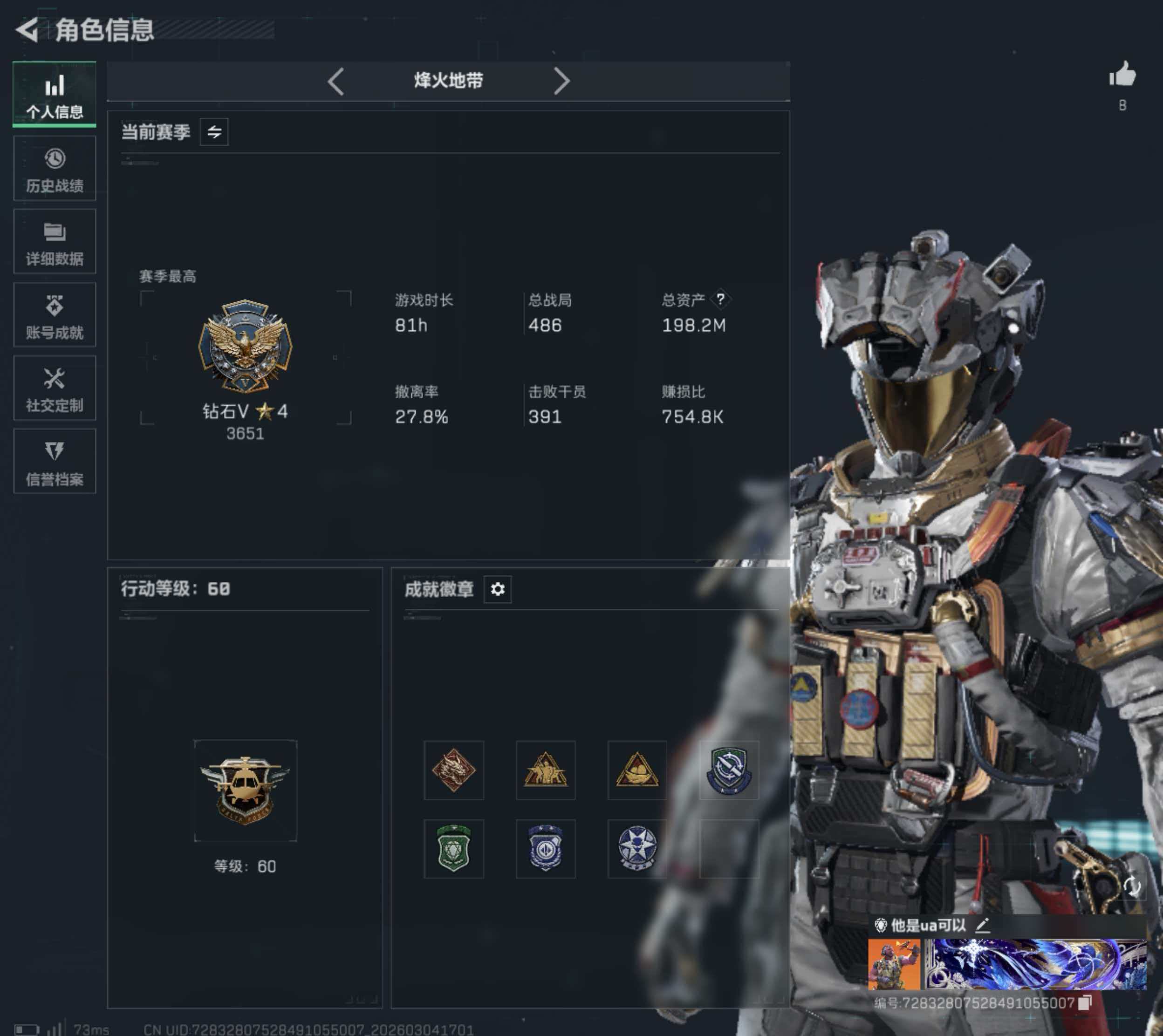 烽火段位黑鹰5 战场段位军士长4 总资产196.3M 哈夫币737W 干员6 挂饰30 近战2 枪械278 载具28