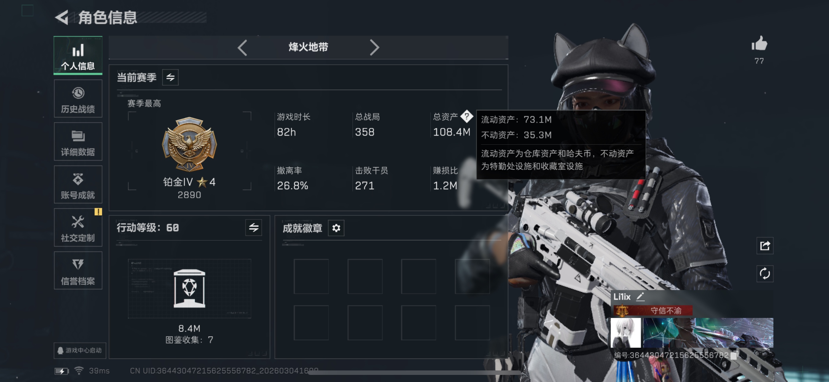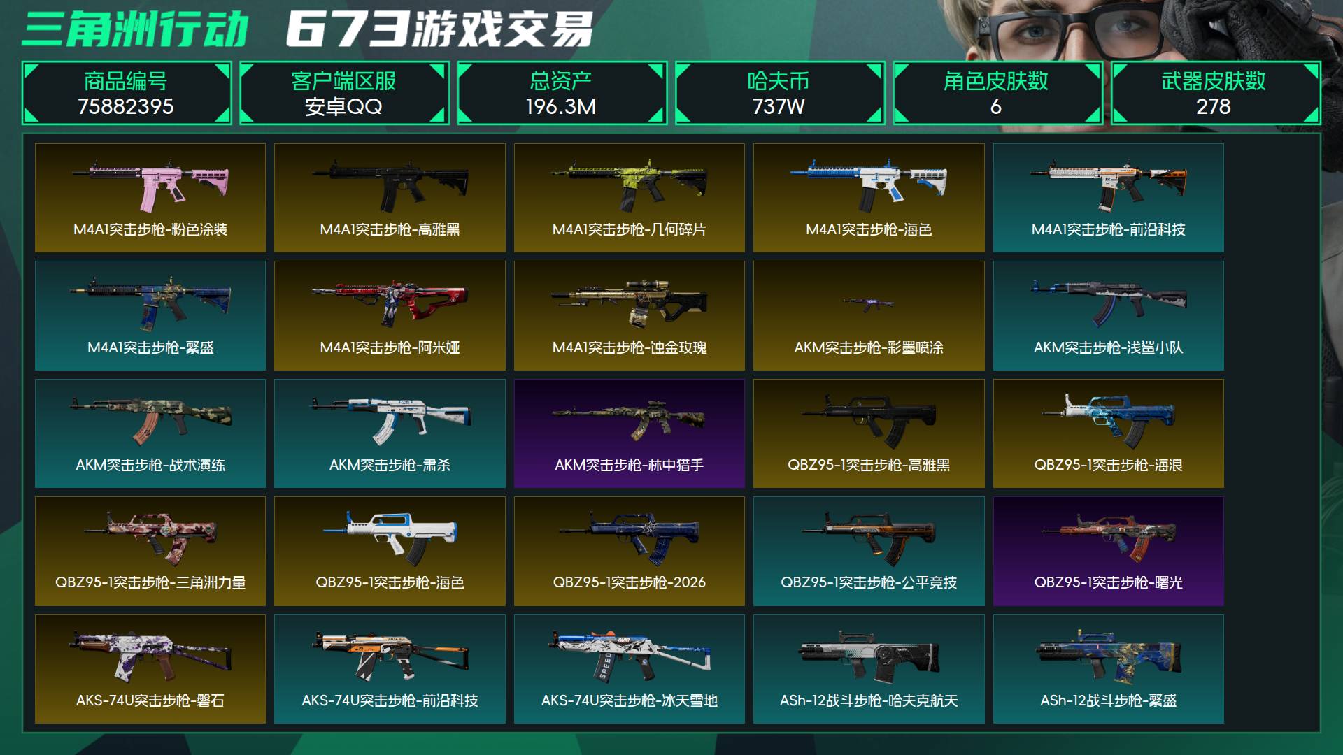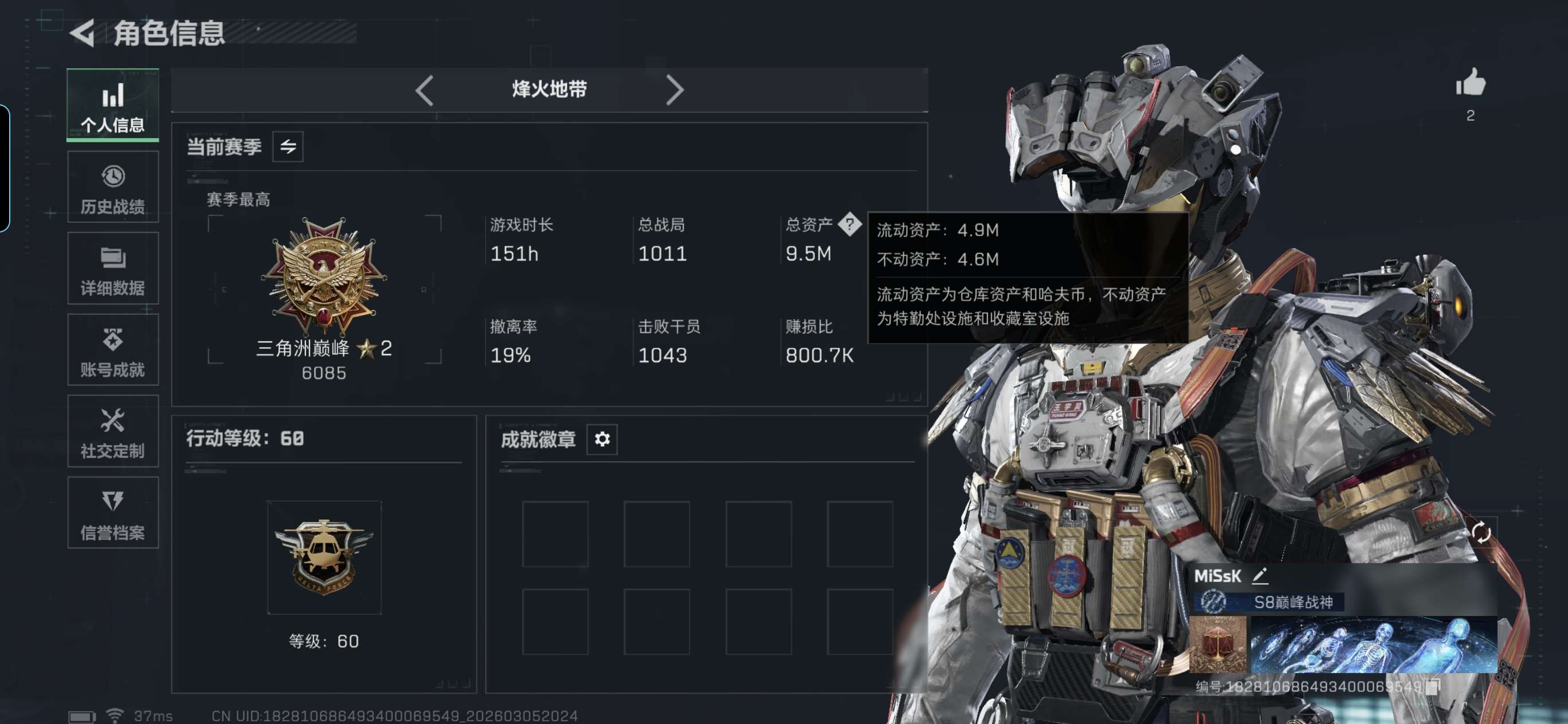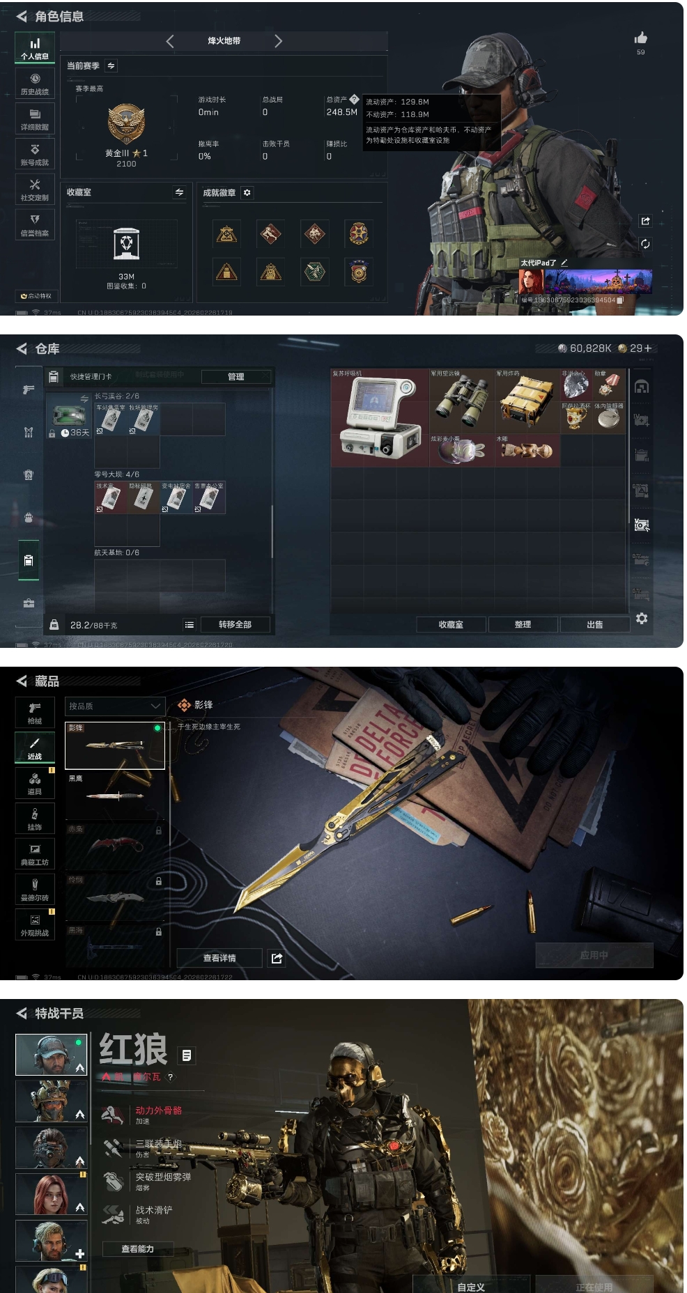 烽火段位黑鹰5 战场段位军士长4 总资产196.3M 哈夫币737W 干员6 挂饰30 近战2 枪械278 载具28
