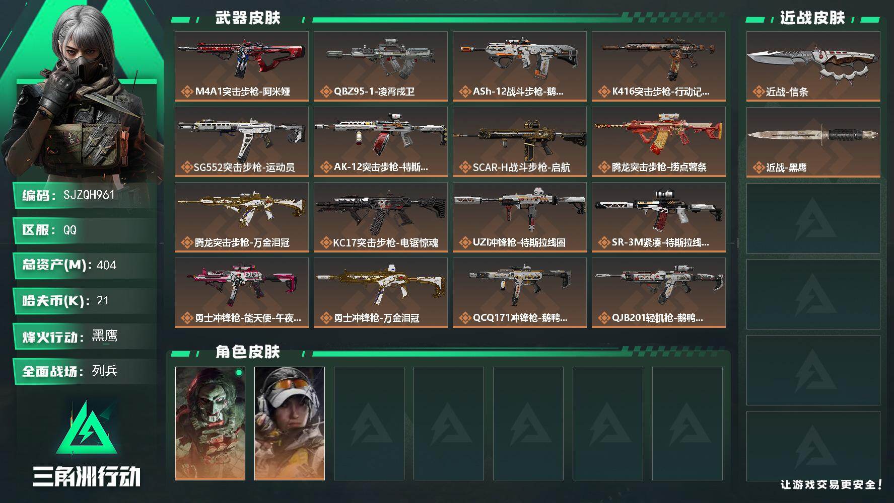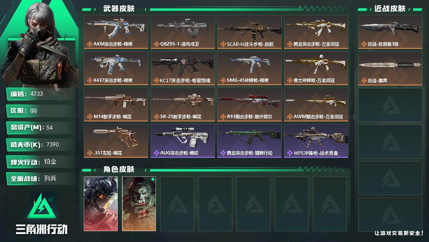 总资产:50.1M 1干员外观 3近战传说 19传说枪械 哈夫币:107.826K