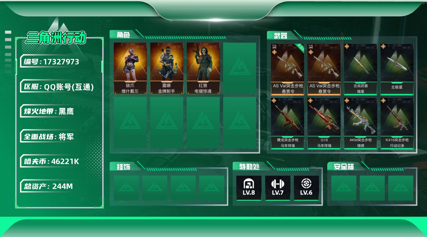 244m总资产-46221k哈伏币-60烽火等级-黑鹰-50战场等级-将军