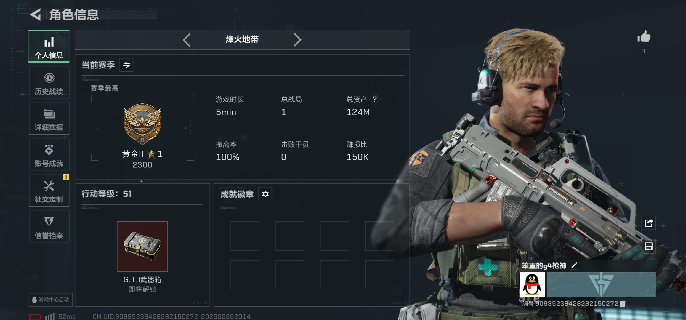 124M,哈夫币:10090W,武器皮肤39,烽火51级:黄金