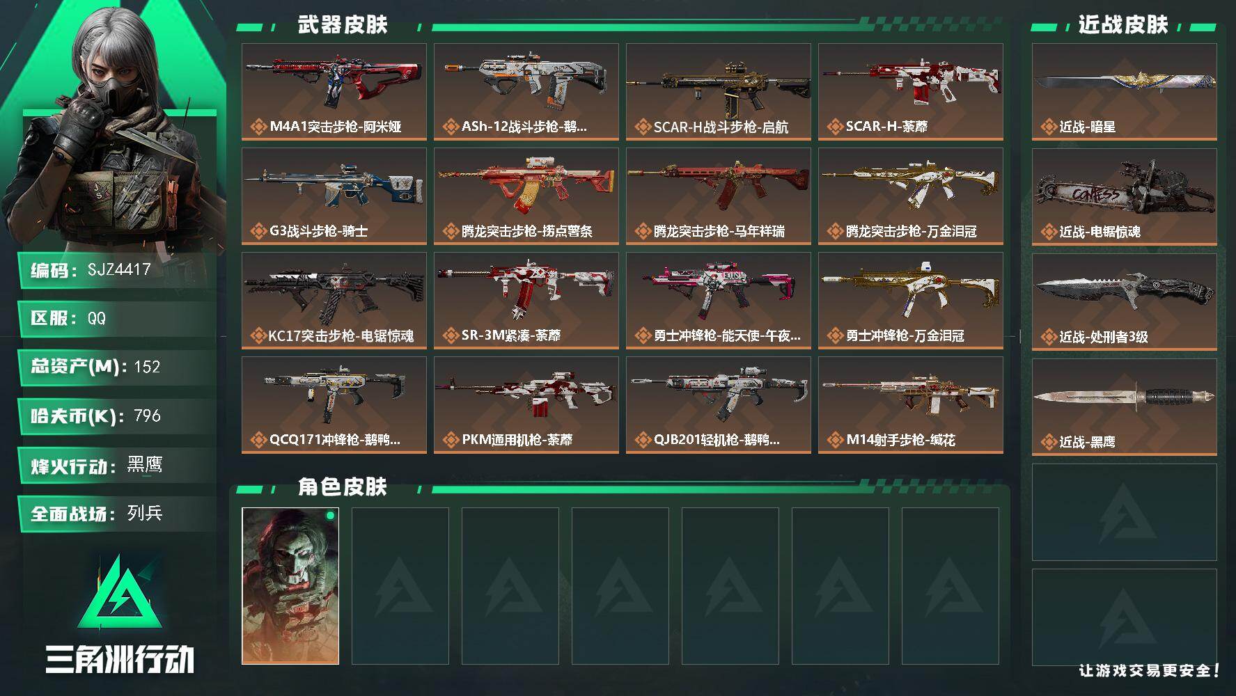 86m总资产-1951k哈伏币-60烽火等级-黑鹰-50战场等级-上等兵
