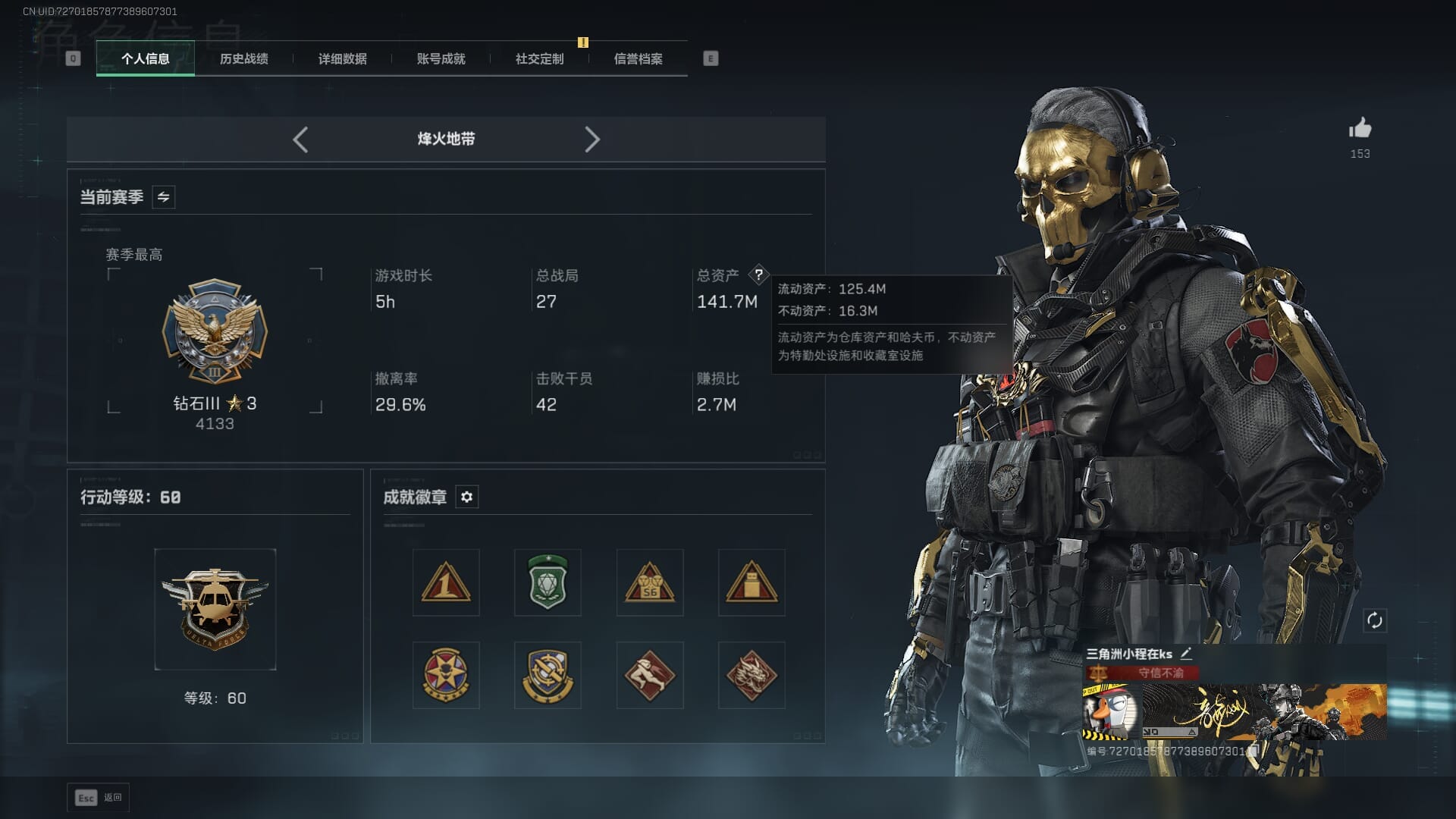 hssjz801 总资产137.53M,哈夫币 31902.36K,战场等级:17 上等兵,行动等级