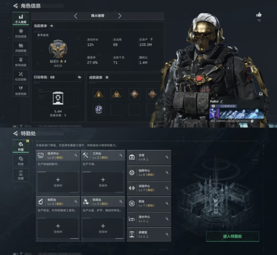总资产(M):203M/哈夫币(K):1394K/传说枪皮数:33/全面战场等级:50_段位:校官/烽火地带等级:60_段位:钻石/