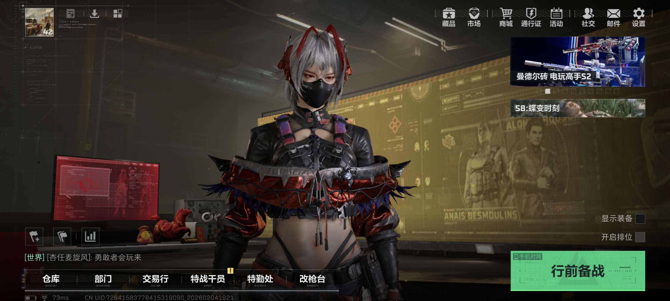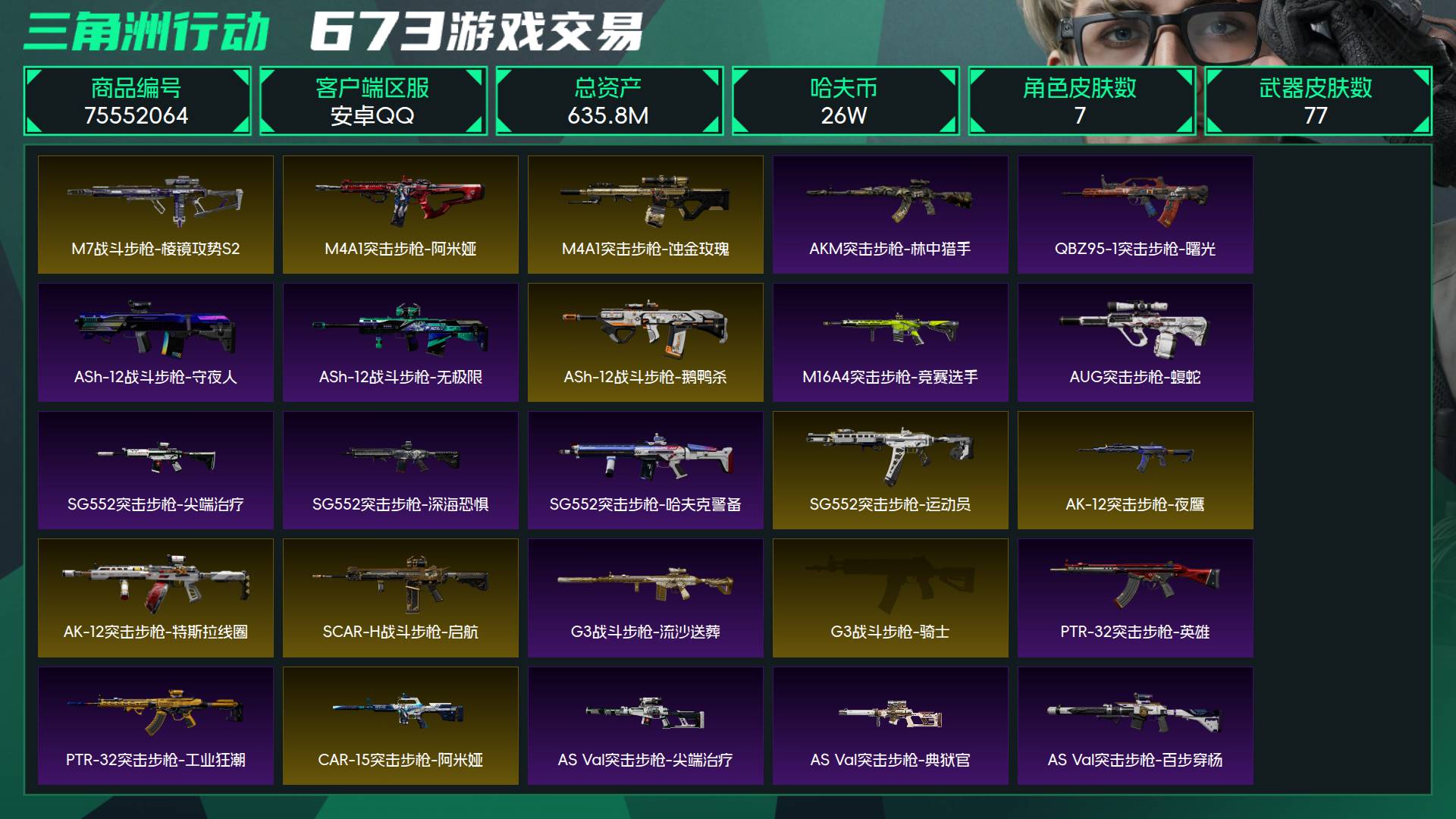 烽火段位钻石2 战场段位上等兵2 总资产635.8M 哈夫币26W 干员7 挂饰30 近战2 枪械77 载具41