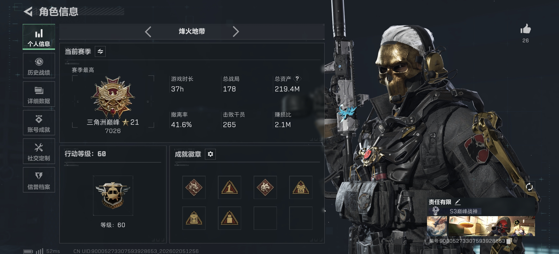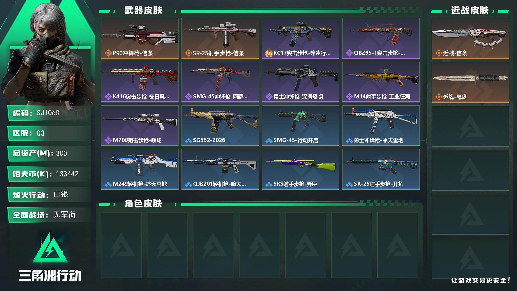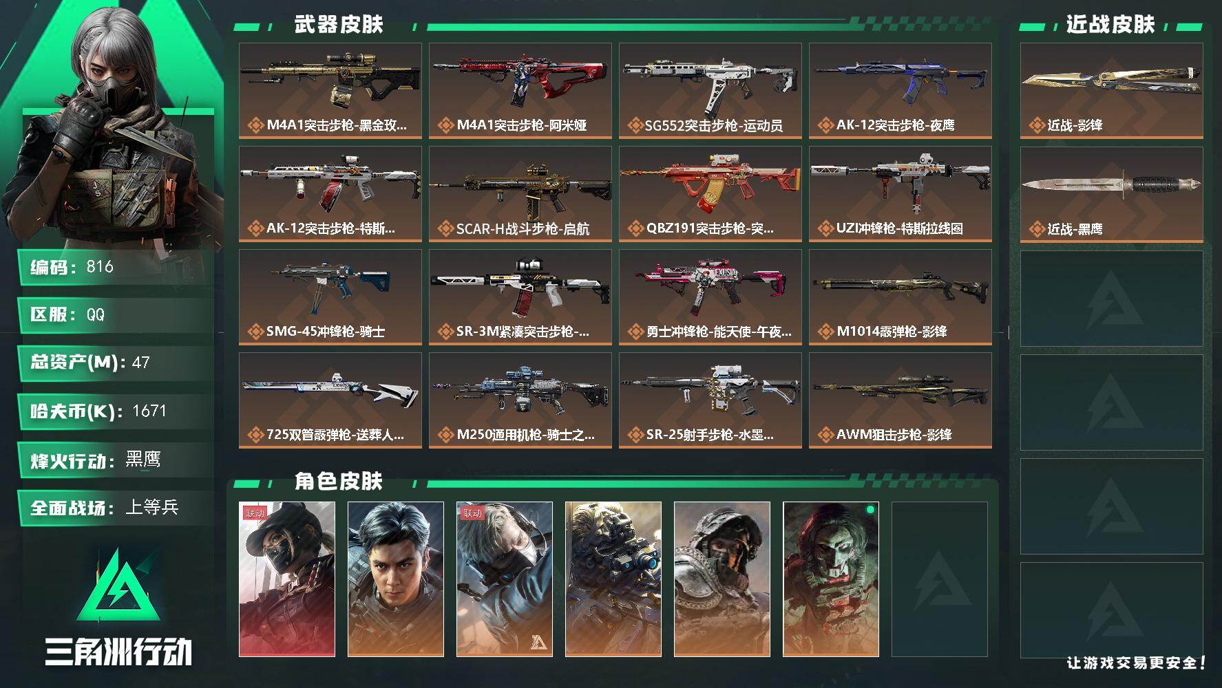 47m总资产-1671k哈伏币-60烽火等级-黑鹰-32战场等级-上等兵【干