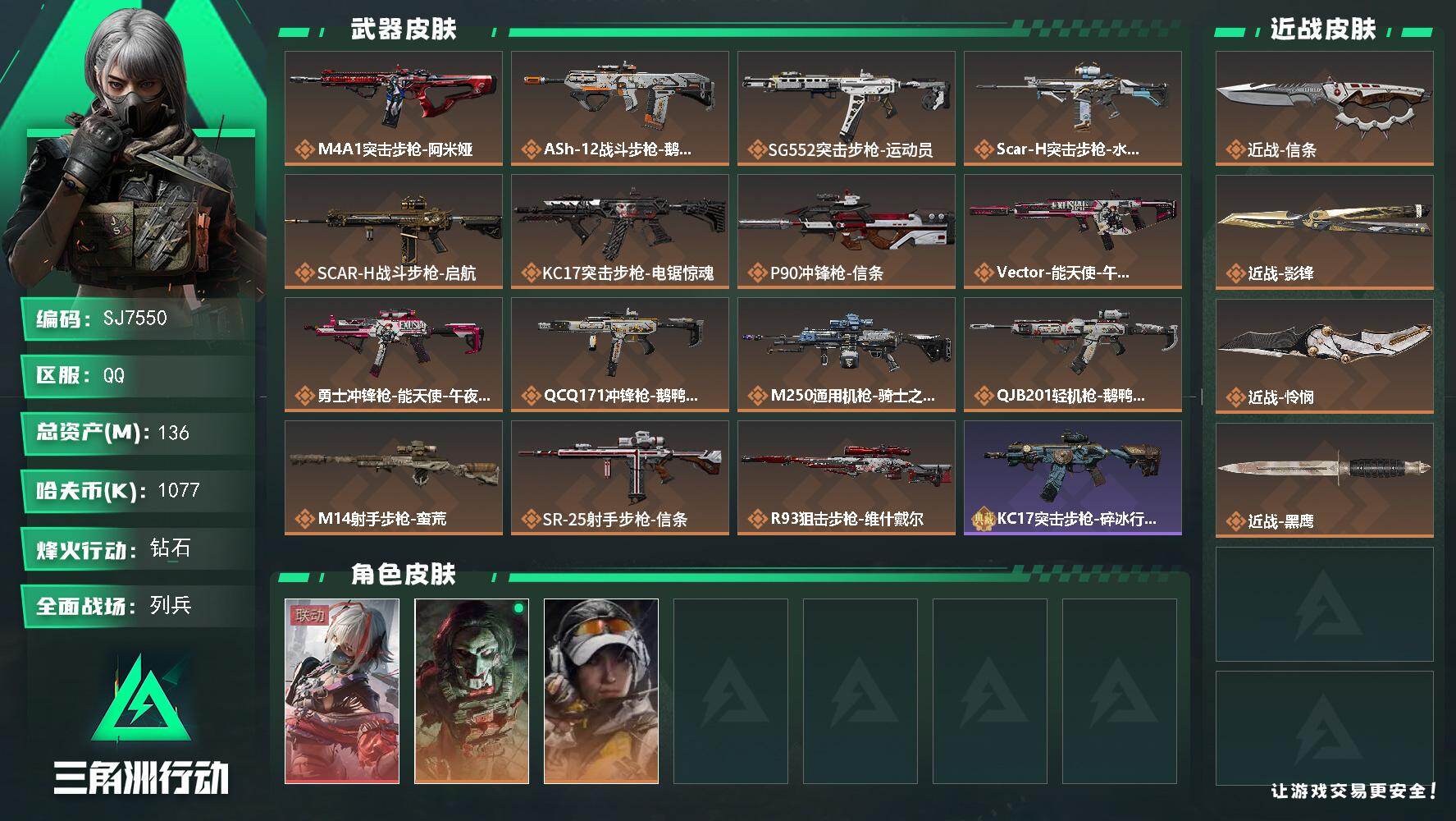 总资产(M):136M/哈夫币(K):1077K/传说枪皮数:15/全面战场等级:12_段位:列兵/烽火地带等级:60_段位:钻石/