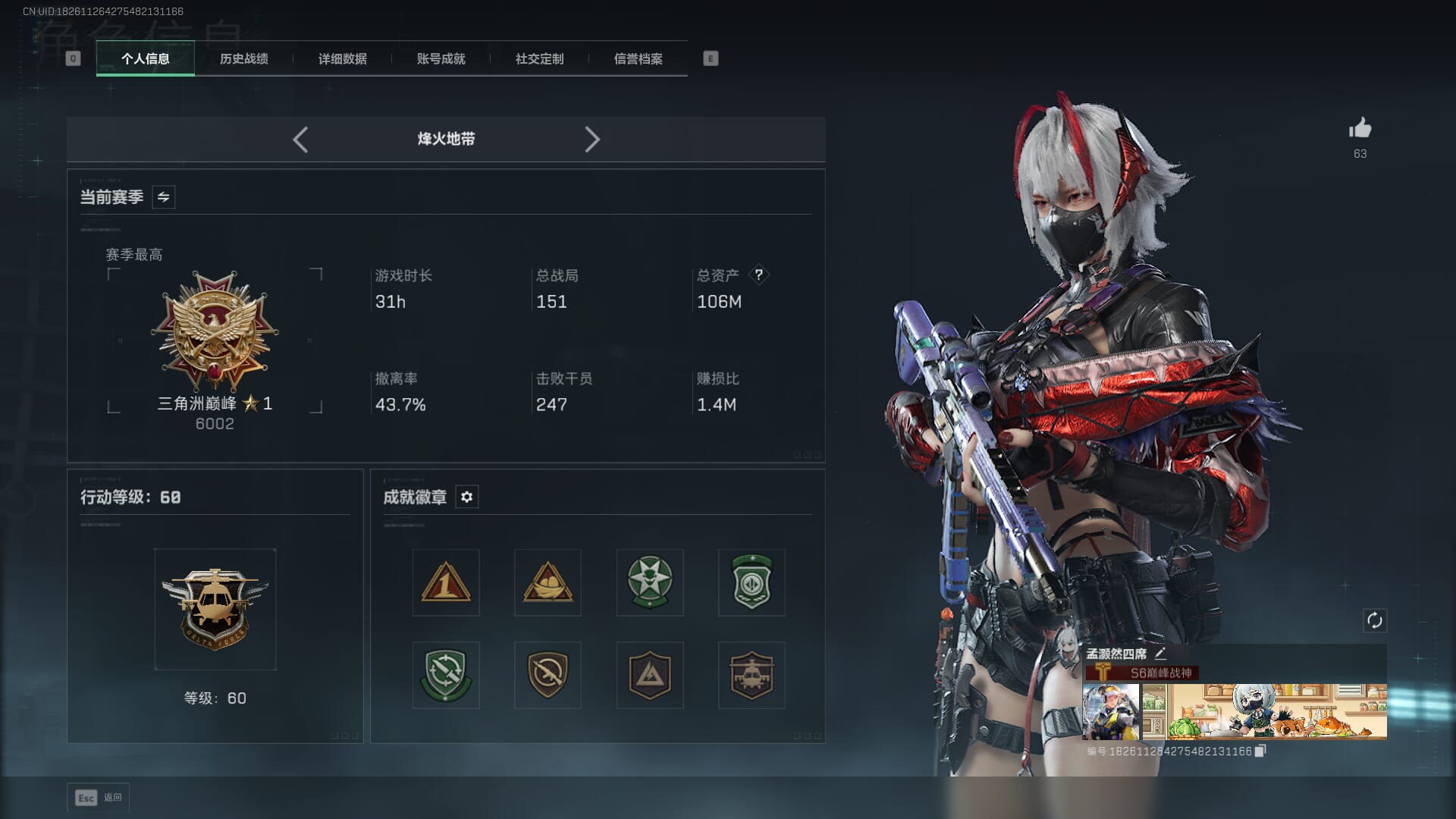总资产(M):47M/哈夫币(K):193K/全面战场等级:6_段位:列兵/烽火地带等级:60_段位:钻石/