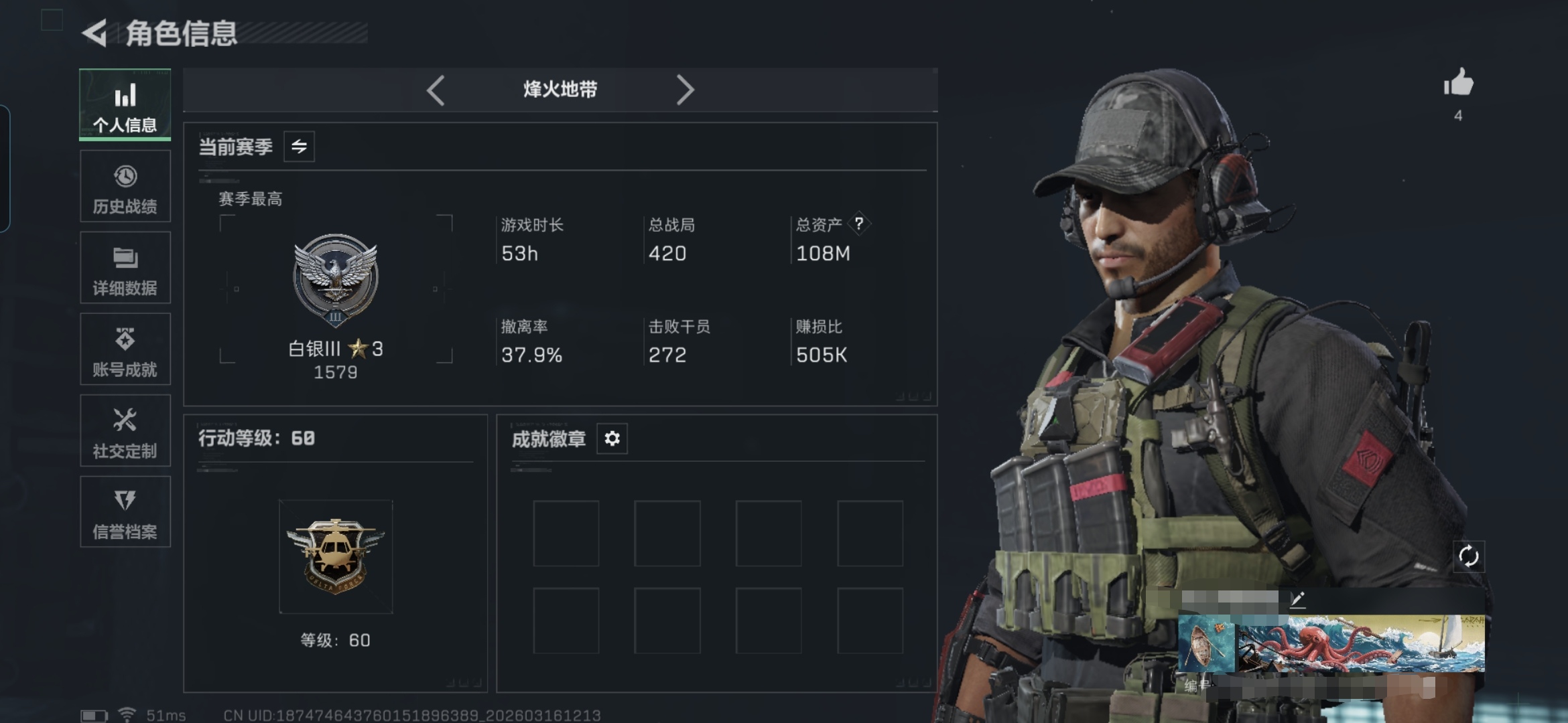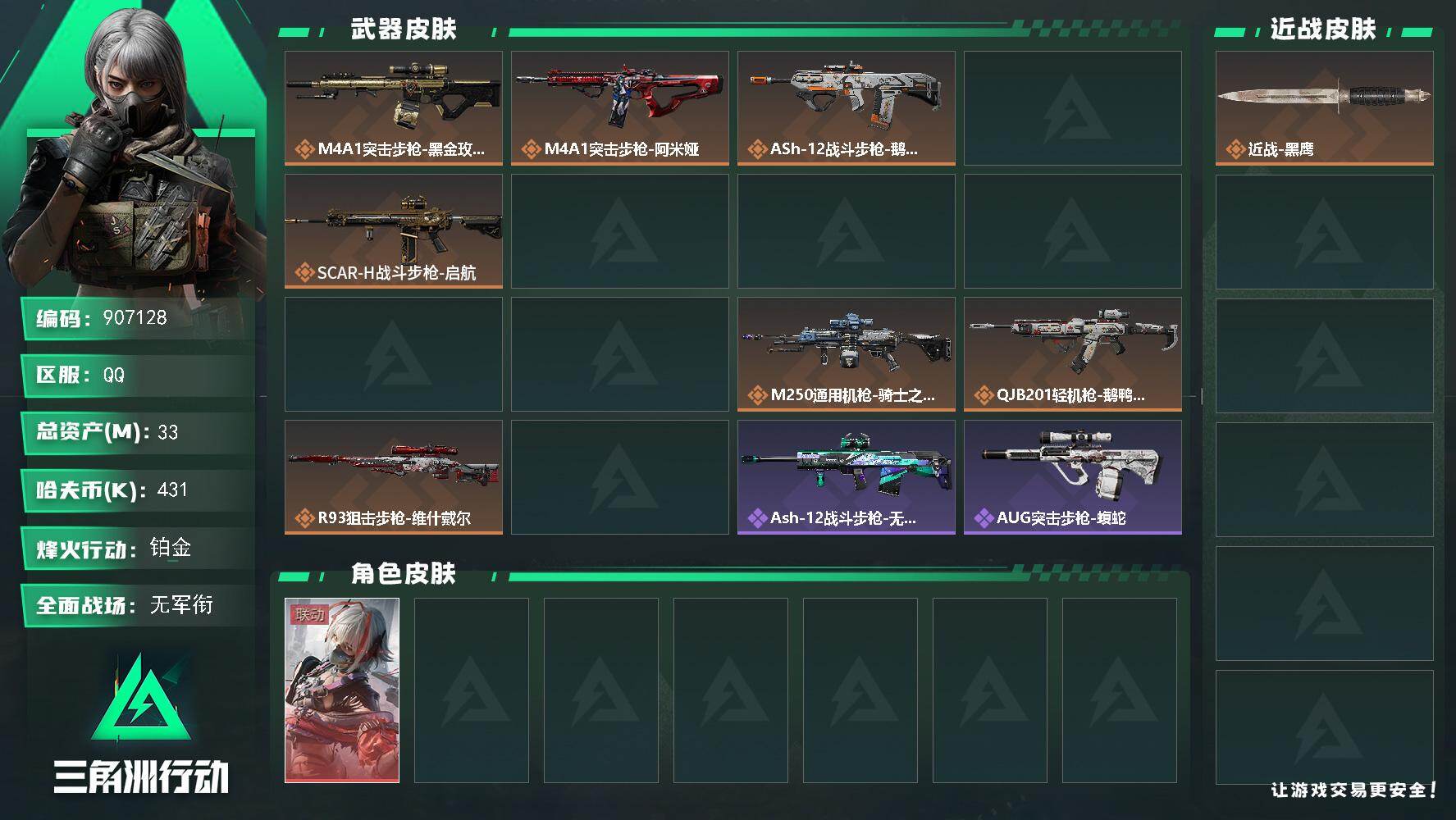 33m总资产-431k哈夫币-60烽火等级-铂金-5战场等级-无军衔【干员外