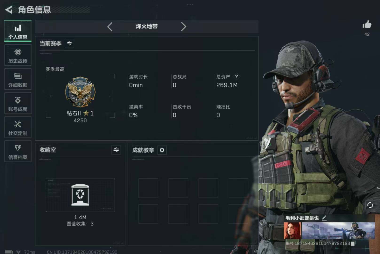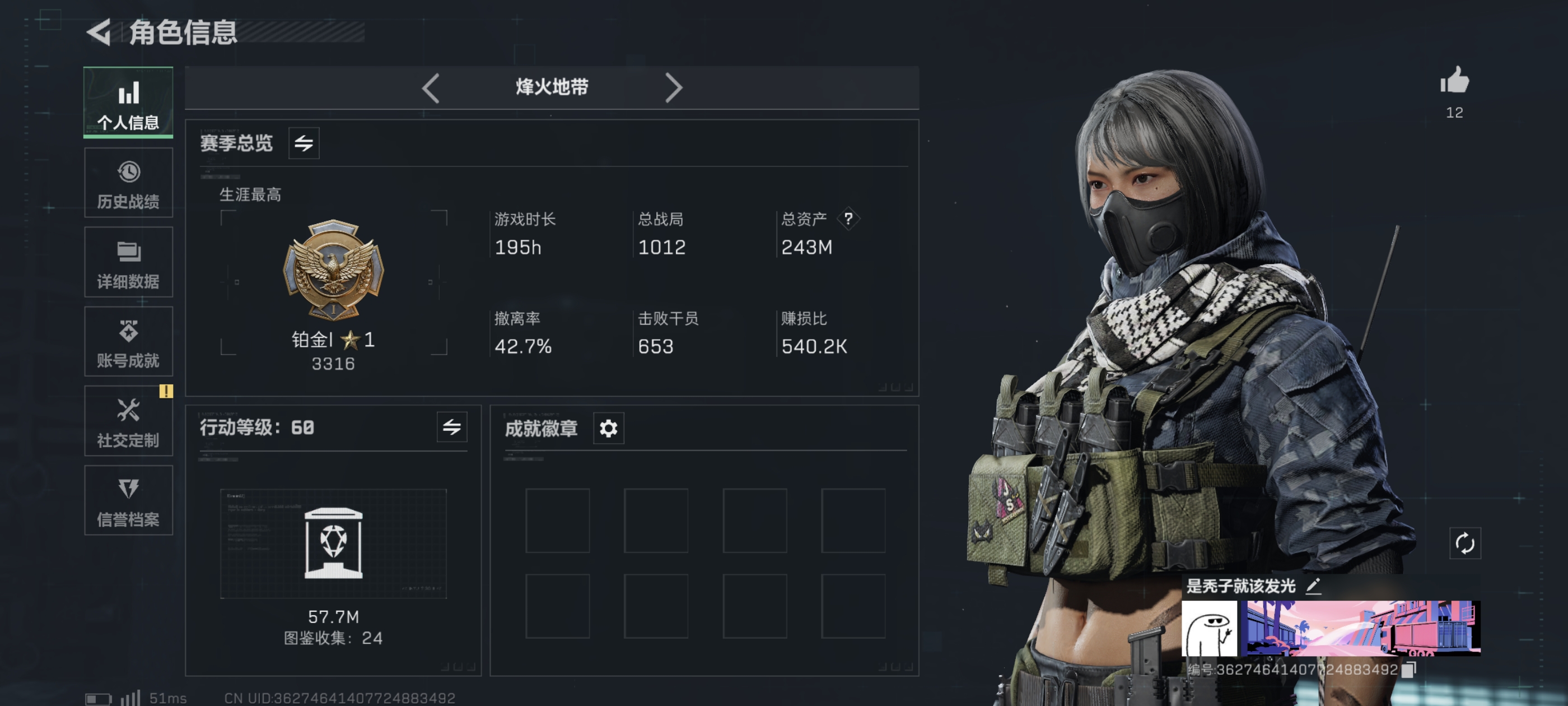 总资产(M):74M/哈夫币(K):163K/传说枪皮数:16/全面战场等级:4_段位:无段位/烽火地带等级:60_段位:铂金