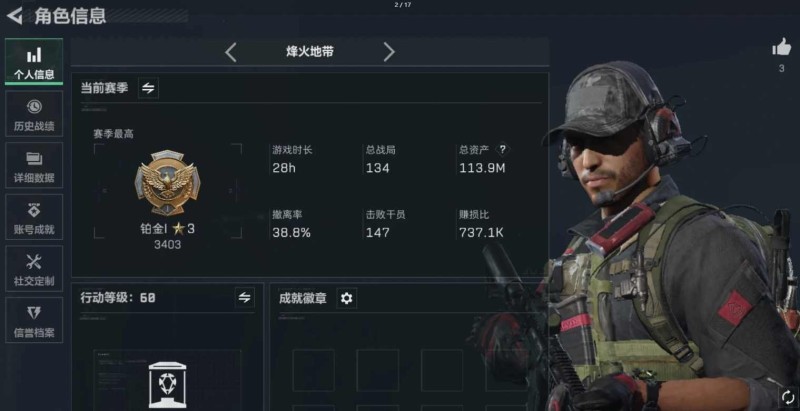 总资产:117M,哈夫币:1274W,武器皮肤88;烽火
