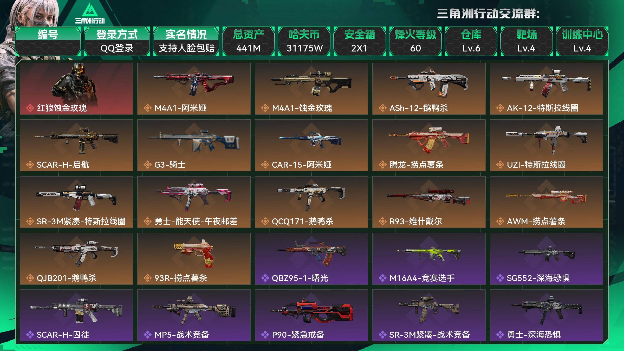 总资产:441M,哈夫币:31175W,武器皮肤74;烽
