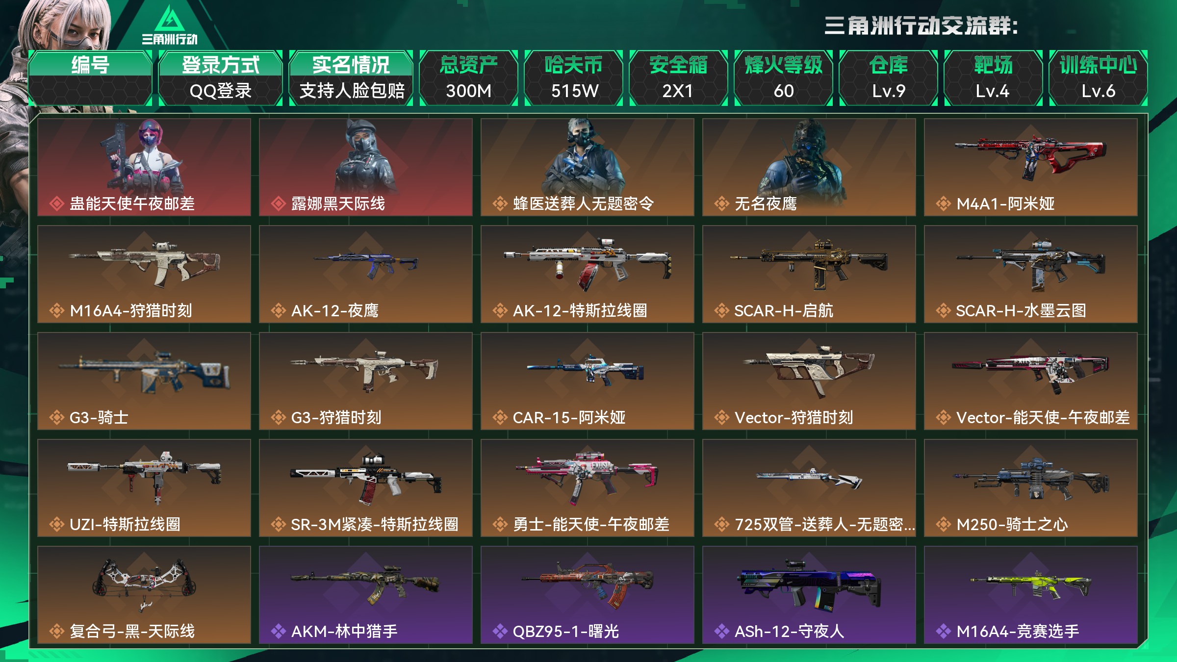 总资产:300M,哈夫币:515W,武器皮肤164;烽火