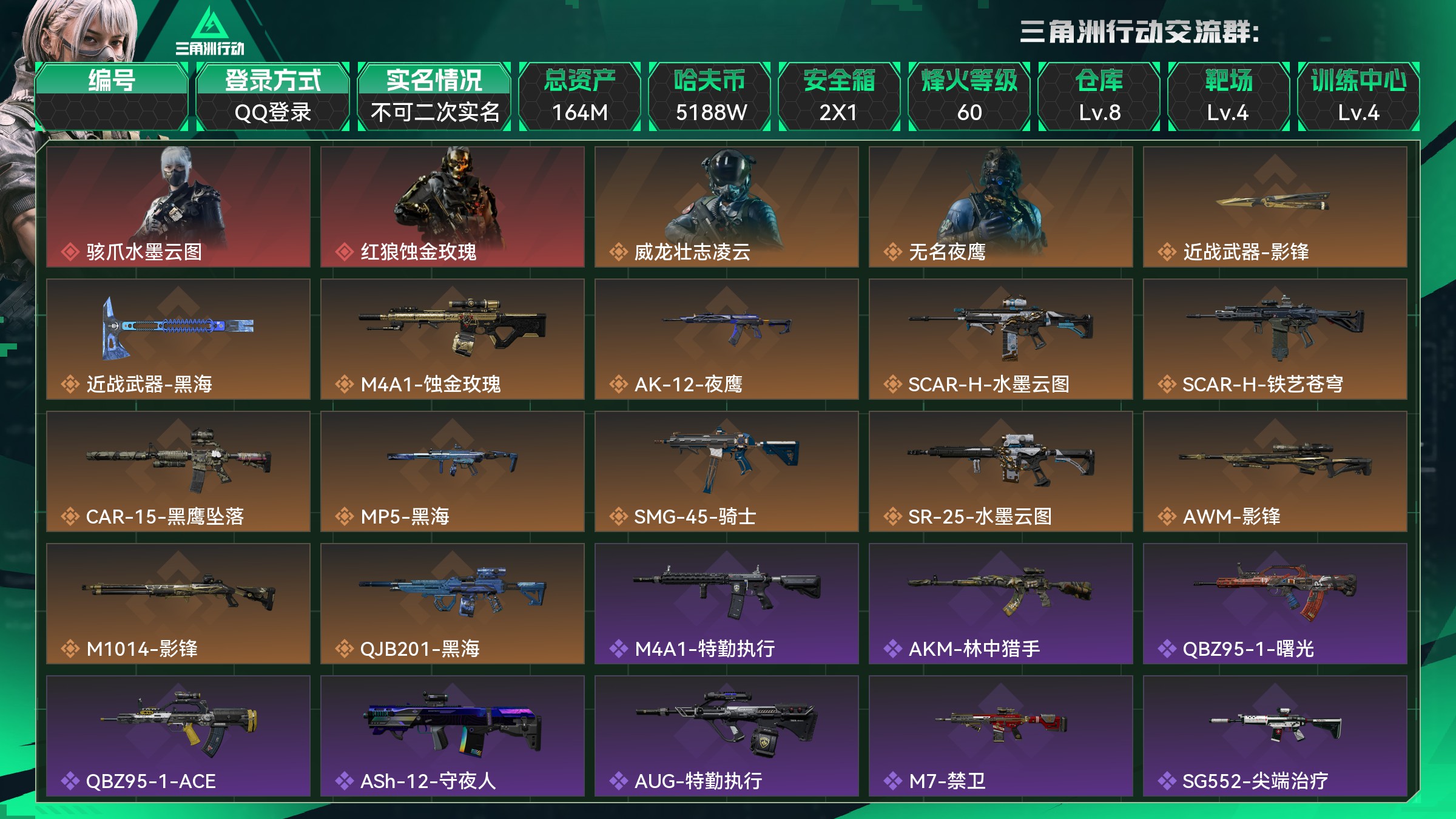 总资产:164M,哈夫币:5188W,武器皮肤124;烽