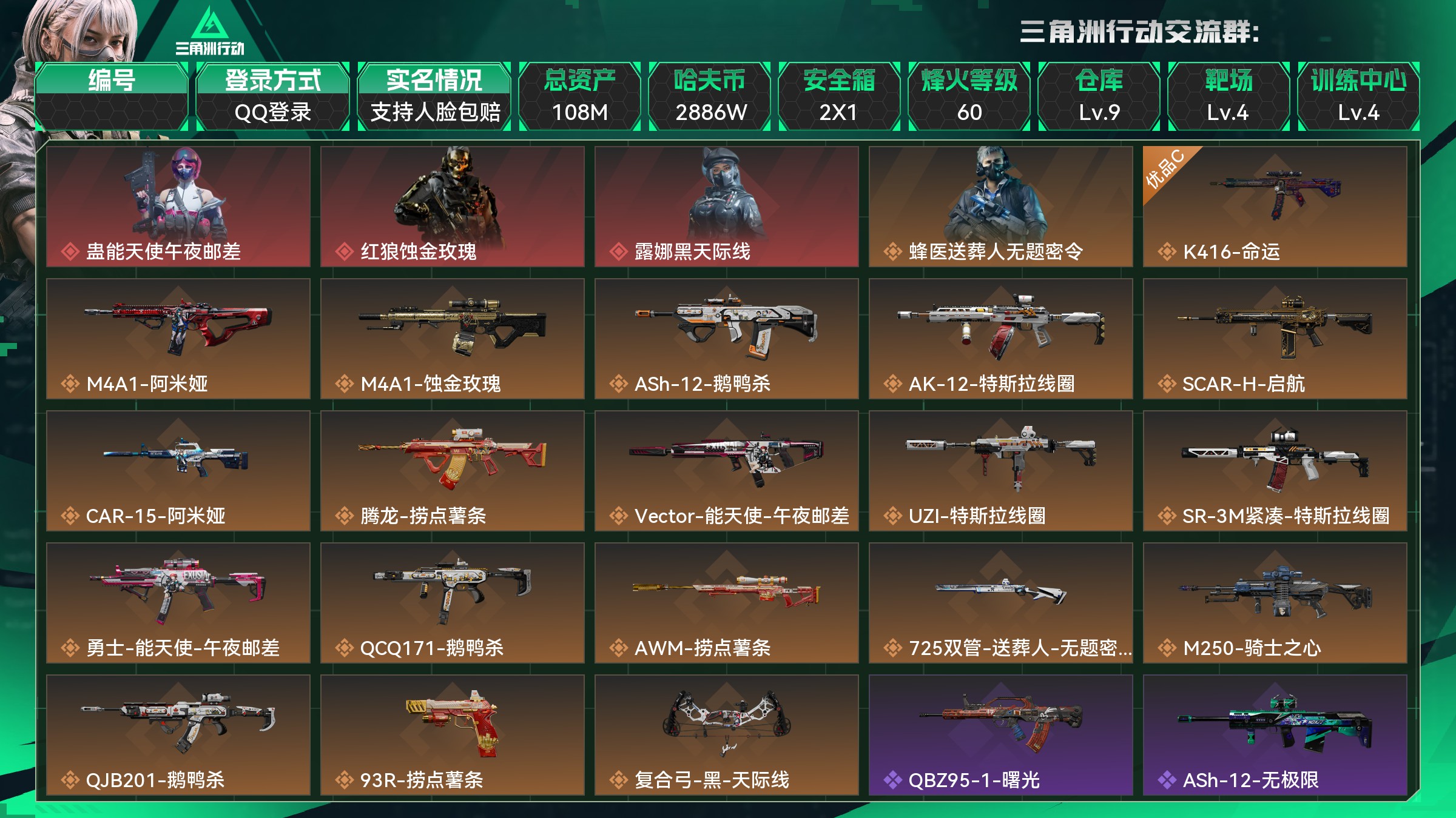 总资产:108M,哈夫币:2886W,武器皮肤129;烽