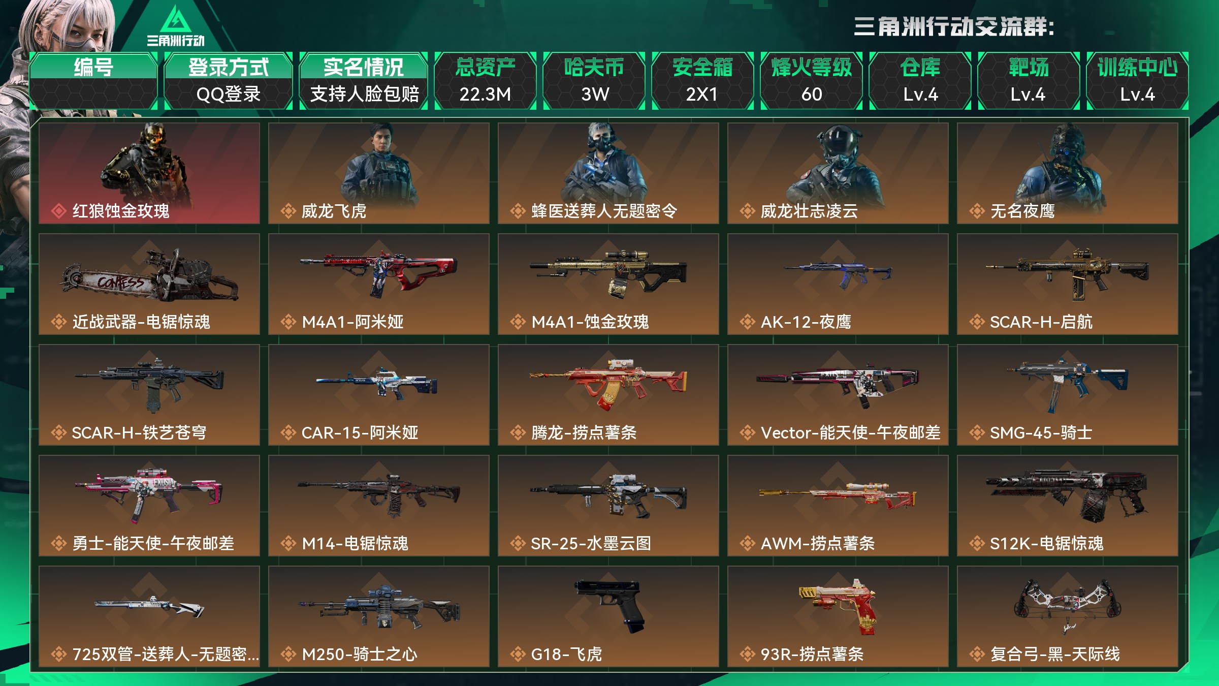总资产:22.2M,哈夫币:1043W,武器皮肤11;烽