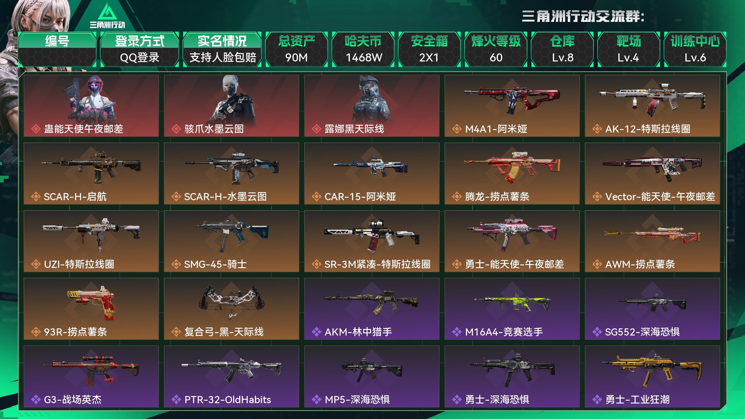 总资产:90M,哈夫币:1468W,武器皮肤121;烽火
